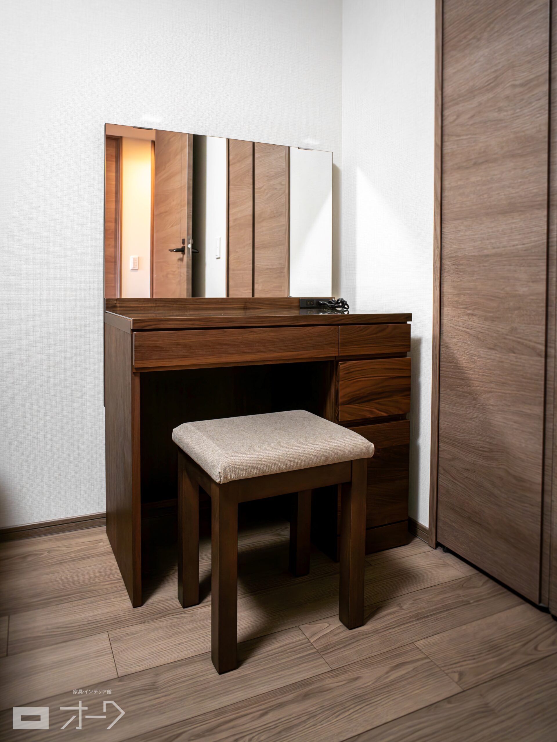 ブラックウォールナット無垢材のドレッサー(鏡台)をお届けしました。シンプルなデザインでお部屋に合わせやすく、デスク幅いっぱいまで広がる鏡は身だしなみを整えるにも使い勝手が抜群です。寝室の限られたスペースにも起きやすい寸法で、憧れの鏡台スペースを身近に楽しんでいただけます。