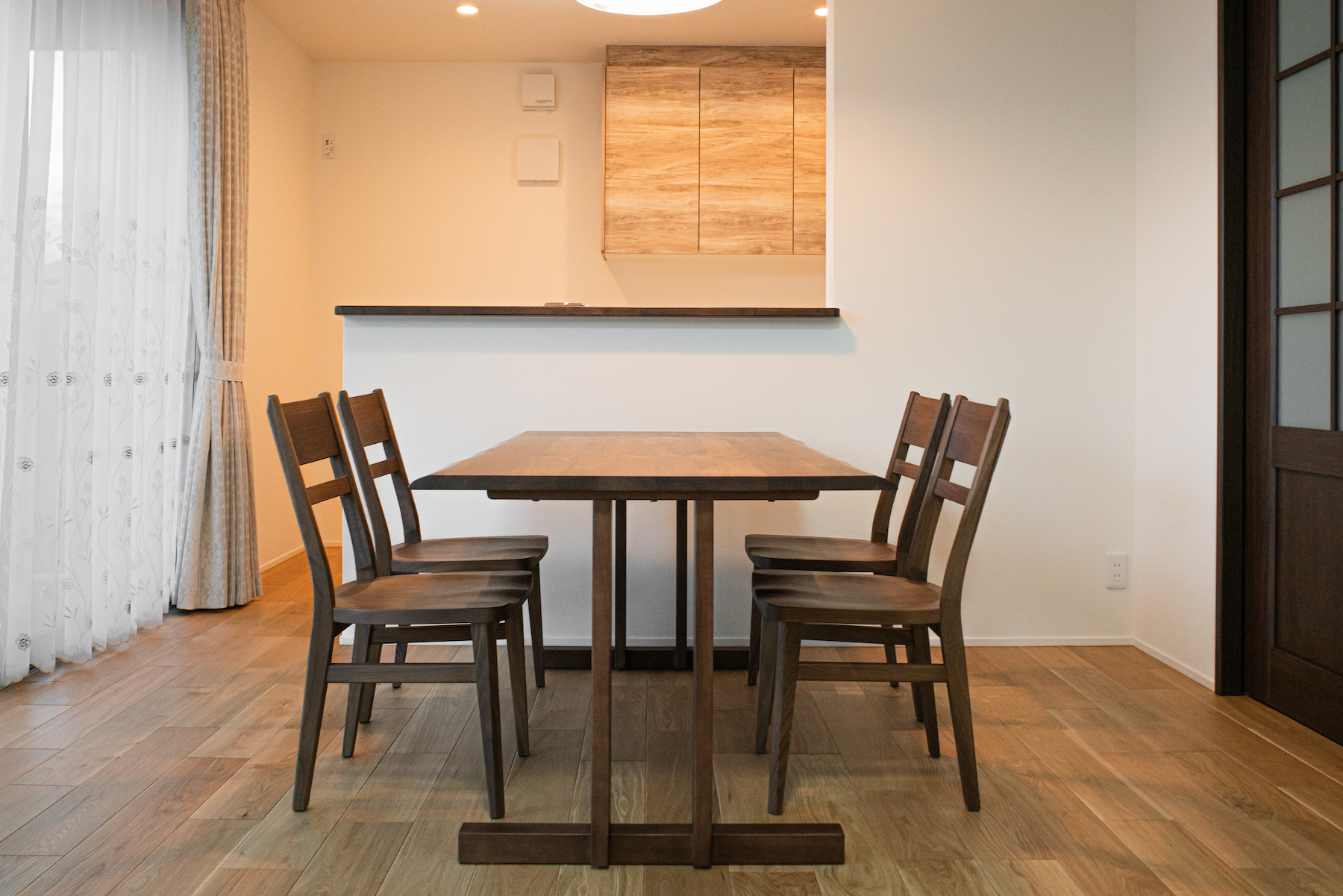 ブラックウォールナット無垢材のダイニングセットをお届けしました。明るい色合いをベースにしたインテリアと、ブラックウォールナットの落ち着いた色味が綺麗なコントラストになっています。椅子4脚はデザインを統一してお選びいただき、フォーマルな印象が強いダイニングスペースに仕上がりました。