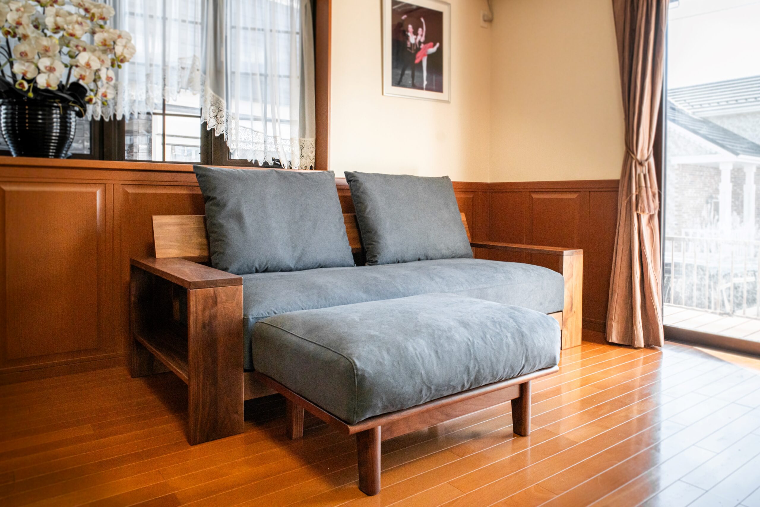 ブラックウォールナット無垢材のソファをお届けしました。肘や背に使われた幅広の無垢材は存在感たっぷり!クッションの生地は旭化成のラムースを使った特注仕様で、ペットとお住まいになられている方でも安心して使い込めるようになっています。スエードのような起毛感は高級感たっぷりで肌触りも良く、ブラックウォールナットの質感ともとても良く合っています。