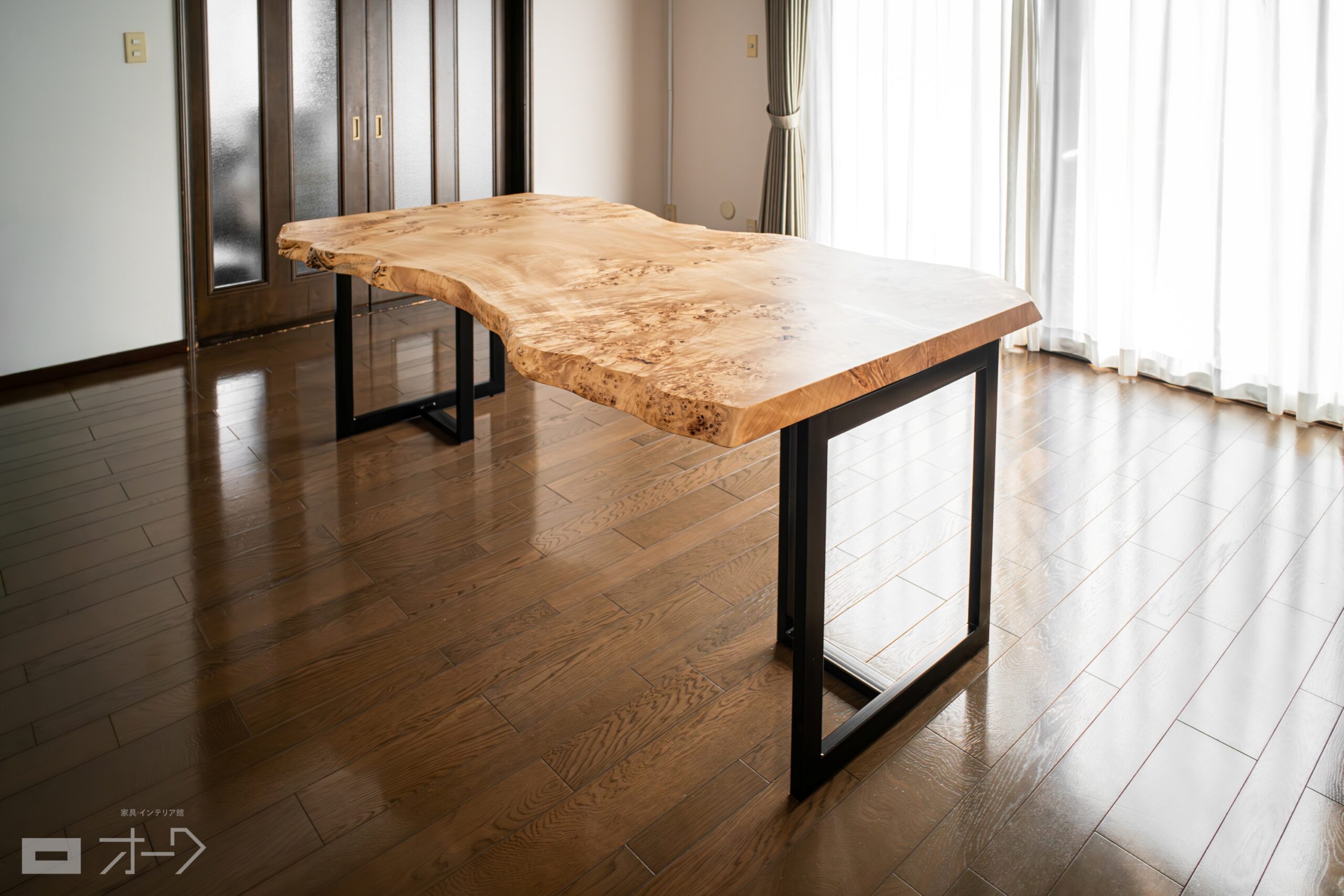 ポプラ一枚板のダイニングテーブルをお届けしました。幅1800×奥行約950㎜の大判サイズで、一枚板ならではのボリューム感を存分に楽しんでいただけます。特にポプラは、その成長過程で自然にできあたる瘤(こぶ)の表情が、他の樹種とは一線を画した迫力を感じさせます。一枚板として流通する量が極端に少ないため、なかなか実物を目にする機会も少ない一枚です。