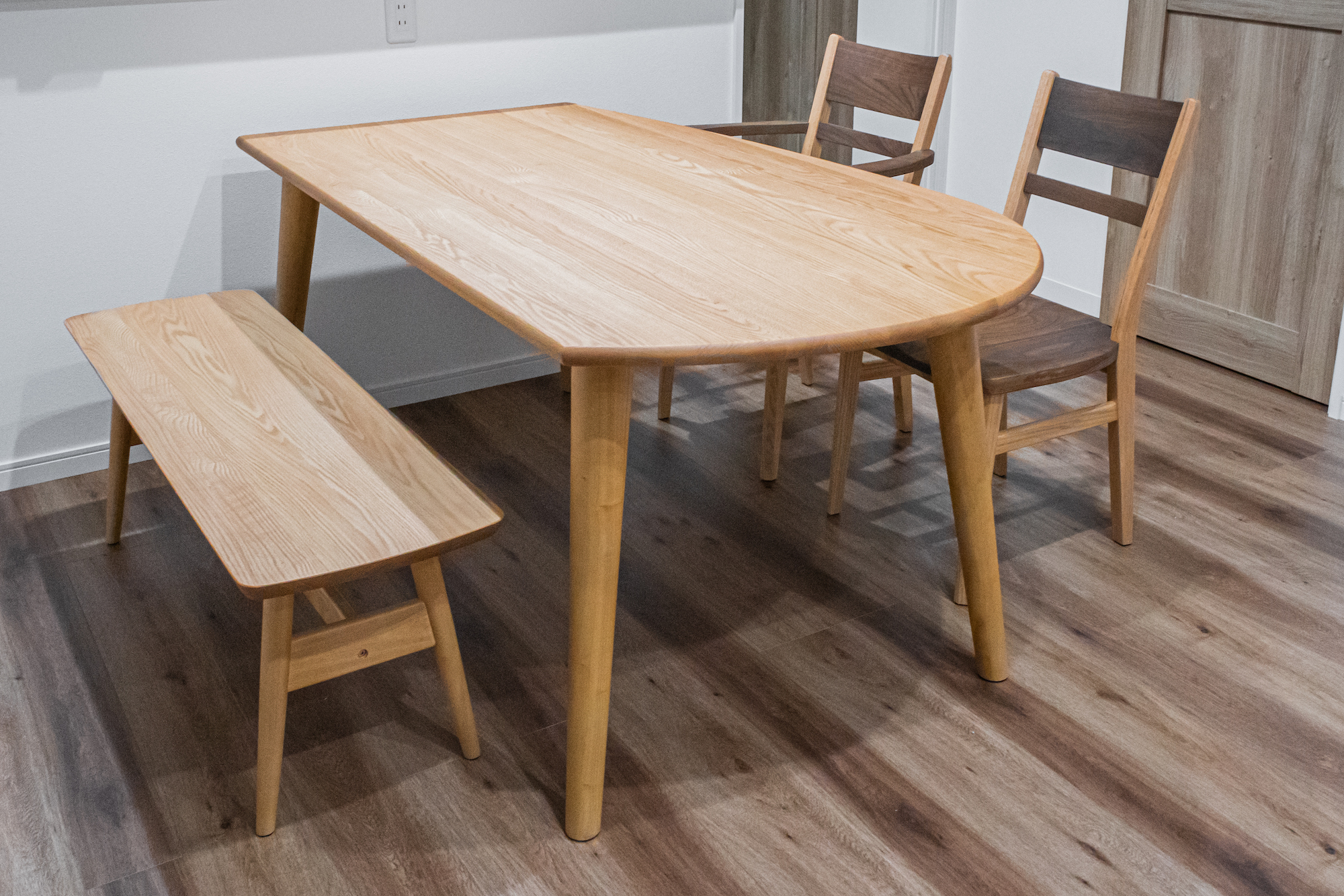 ナラ(オーク)無垢材のダイニングセットをお届けしました。可愛らしい形が人気の変形テーブルに、ブラックウォールナット無垢材を用いたツートンの椅子を合わせていただきました。天然木らしく、可愛らしい雰囲気に仕上がりました!