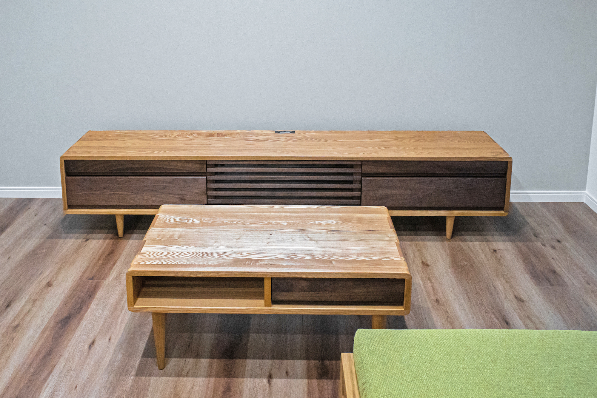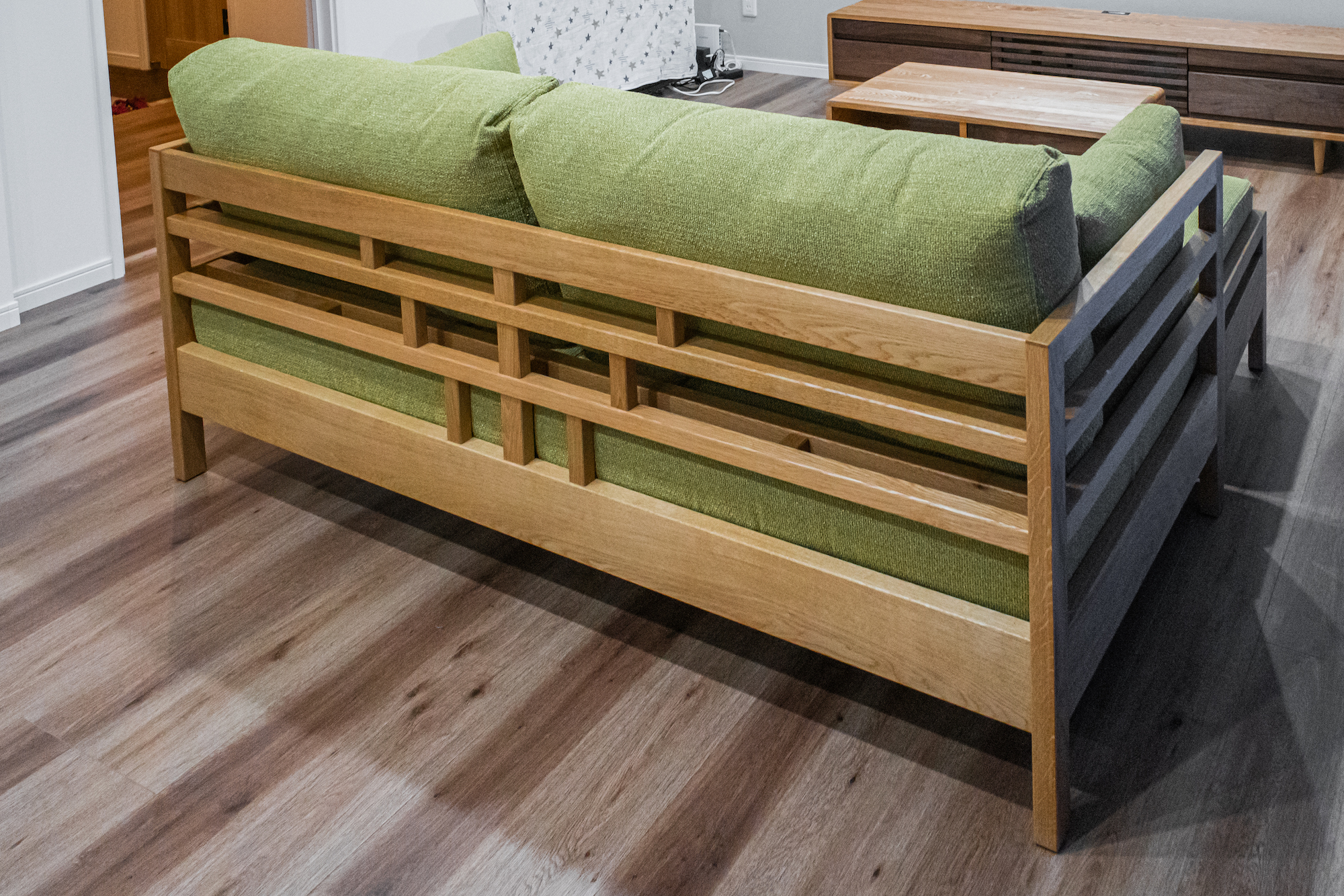リビングスペースも、ナラ(オーク)無垢材をベースにお選びいただきました。テレビボードやセンターテーブルには一部にブラックウォールナット無垢材を用いて、ダイニングスペースとの共通性を持たせています。ソファは無垢材をふんだんにつかった豪華なデザインで、背面から見ても抜群の存在感です。