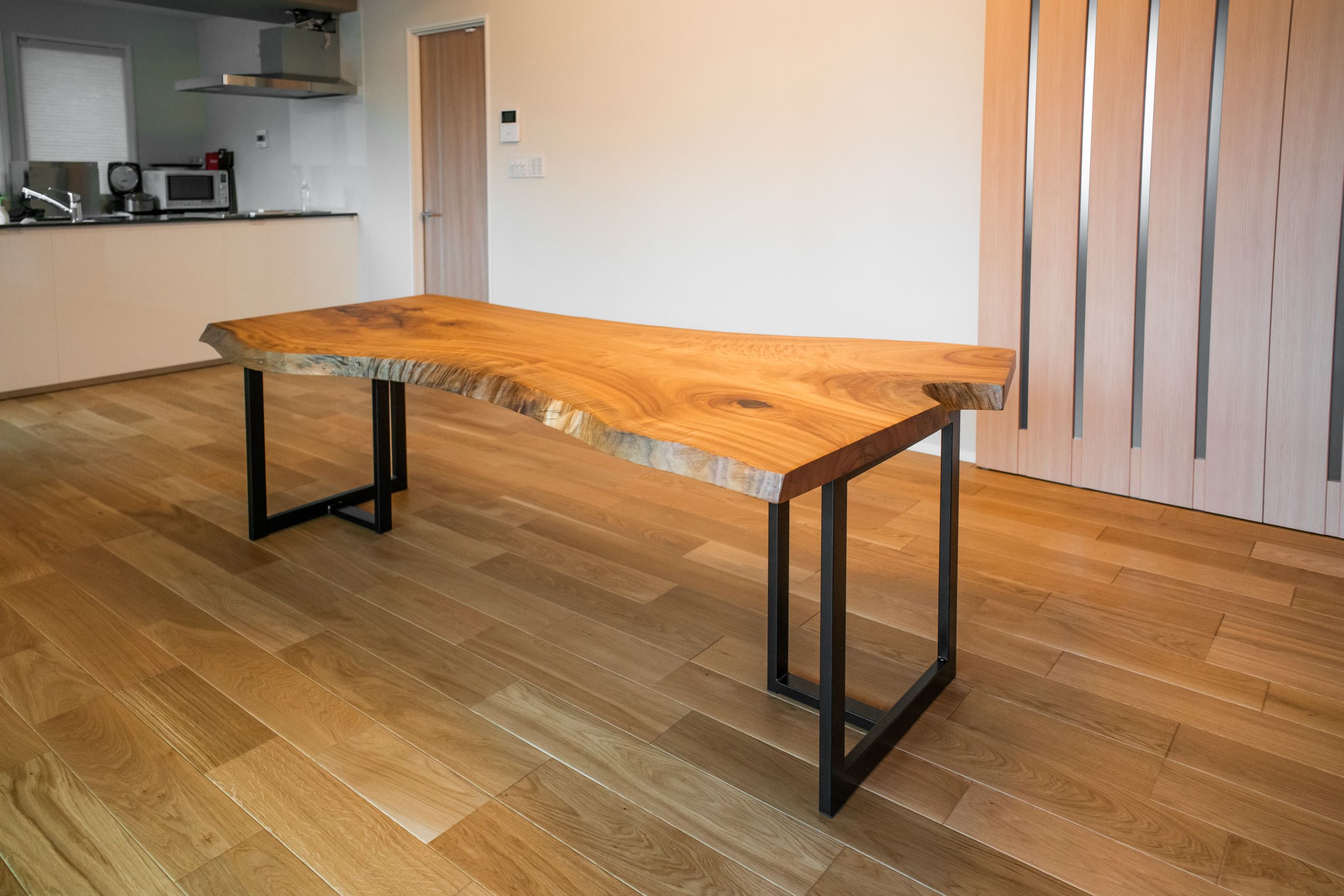 楠(クス)一枚板のダイニングテーブルをお届けしました。一枚板ならではの豪快な耳(丸太の表面)が印象的な一枚で、幅2000を超えるサイズは迫力も抜群です。広々としたスペースを活かして、まさに空間の主役となるテーブルになりました。