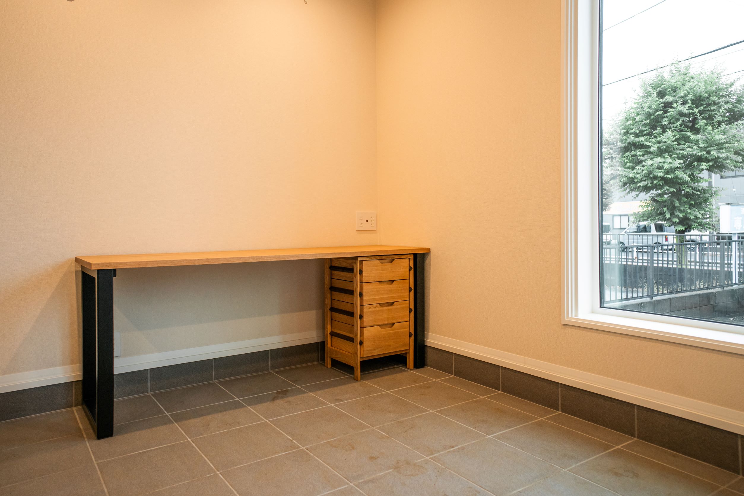 いずれは事務所としてもお使いになられる予定の土間スペースには、幅1800ミリのカウンターデスクをお選びいただきました。とてもシンプルなデザインで、ナラ(オーク)無垢材の質感が際立ちます。下部に収納できるサイズに脚を調整したキャビネットも可愛らしいですね!