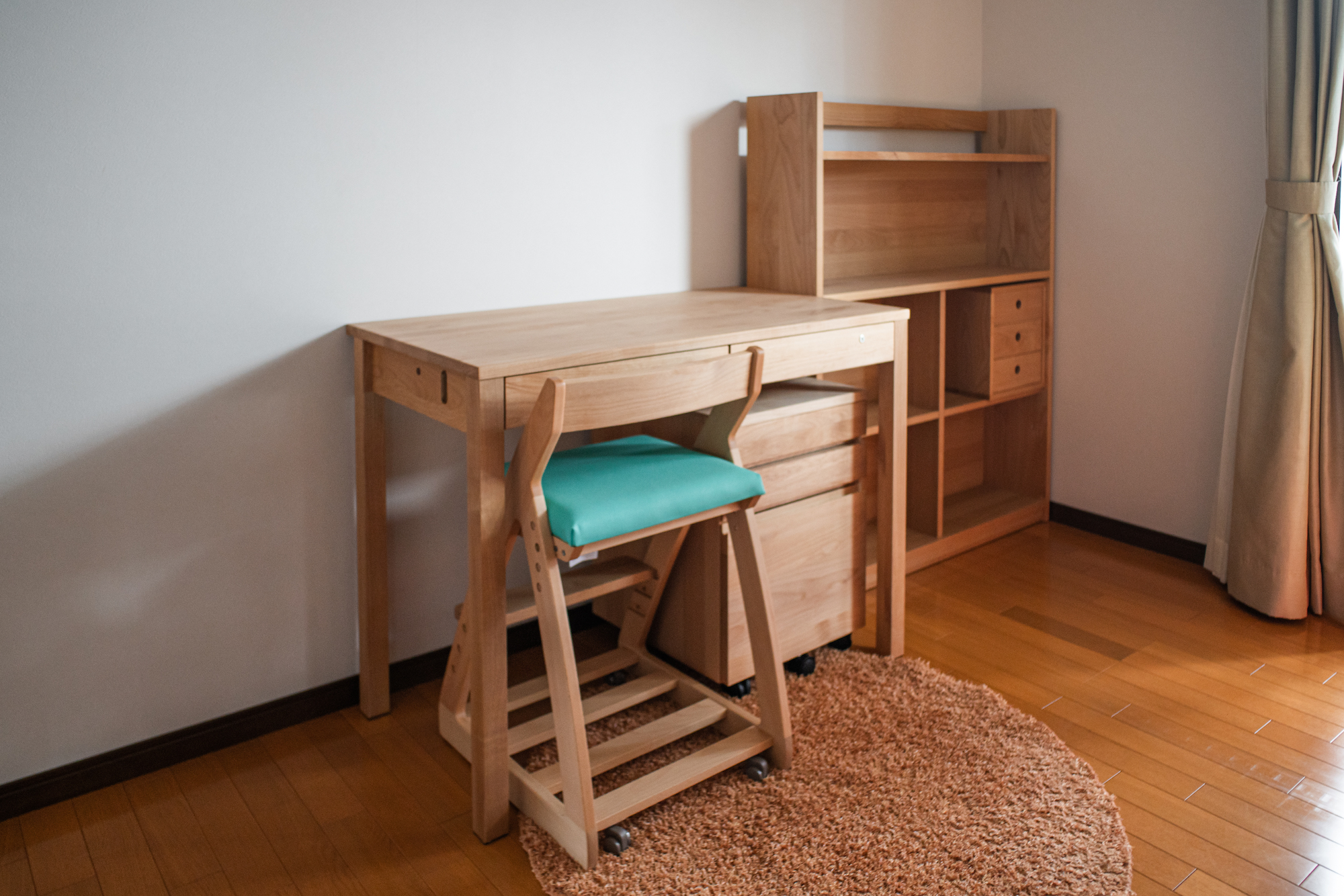 お子様様にもアルダー無垢材のデスクセットをお選びいただきました。非常にシンプルなデザインで、大人の方でも使える家具としてご用意しています。明るめのトーンで手触りも良く、温かみのあるアルダー材がご好評のデスクセットです。