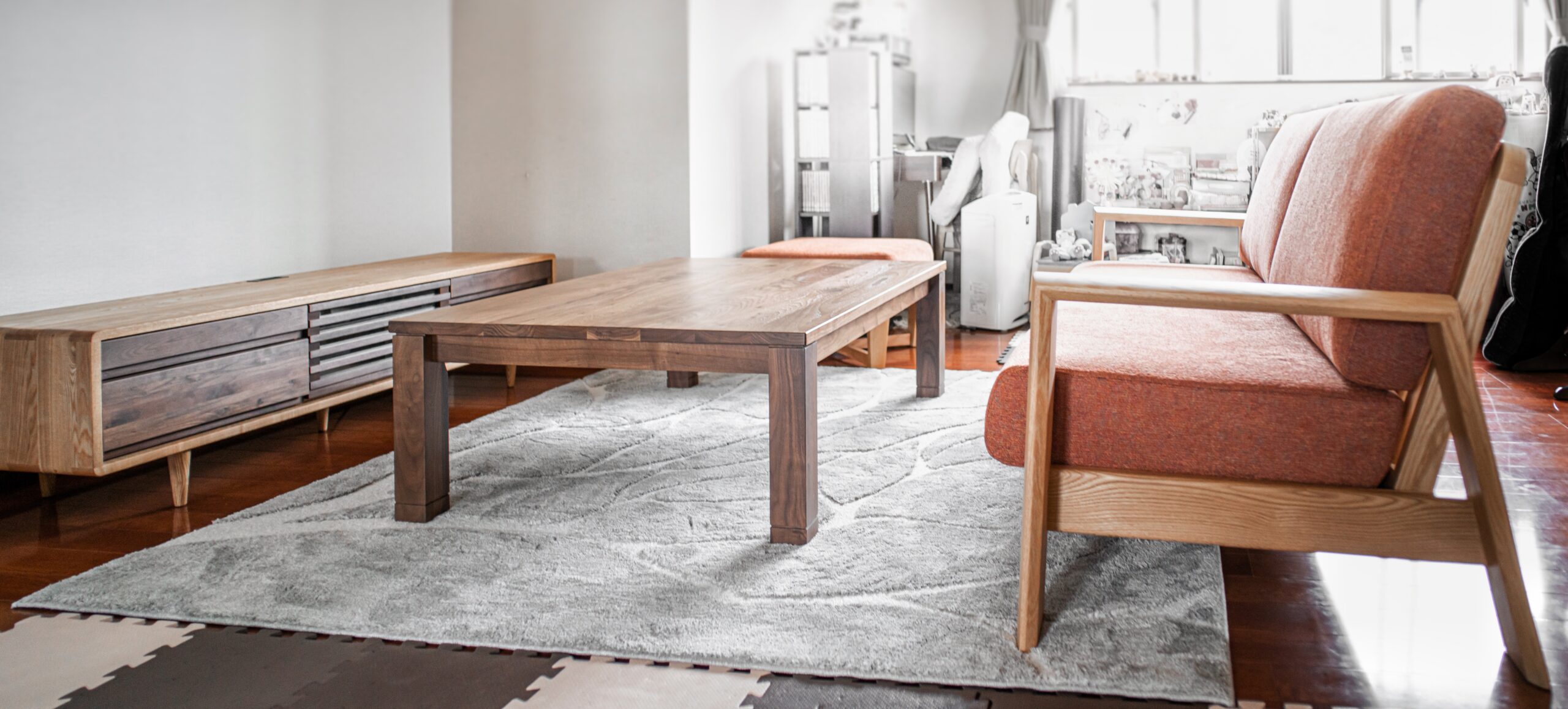 ブラックウォールナット無垢材 / オーク無垢材のリビングセットをお届けしました。トーンが違う素材同士もほどよく調和するのが無垢材の楽しいところです。センターテーブルは無垢天板のこたつとしても使える特殊な仕様で、天然木の質感がたっぷり味わえる贅沢な空間に仕上がりました。