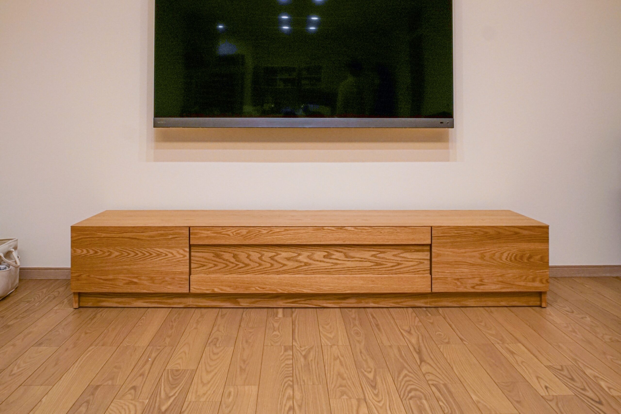 リビングスペースには、ナラ(オーク)無垢材のテレビボードをお選びいただきました。シンプルで直線的なデザインは、壁掛けテレビの足元を飾るのにも最適です。収納家具の役目も果たしつつ、空間を豪華に彩ってくれますね!