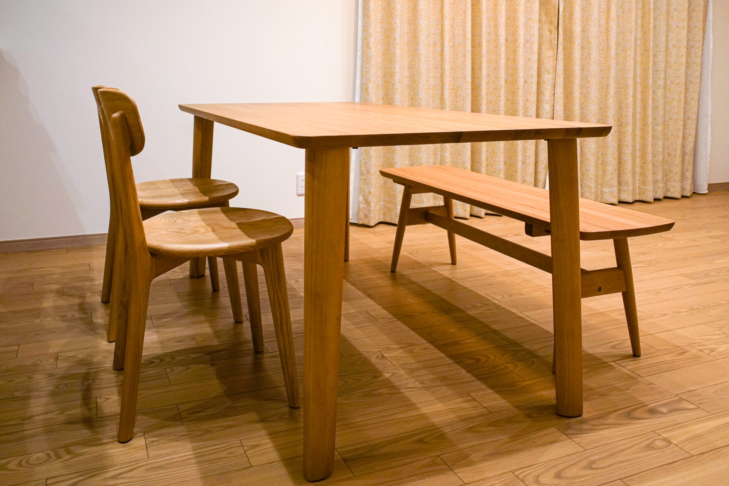 ナラ(オーク)無垢材のダイニングセットをお届けしました。少し丸みを帯びた優しいデザインで、ゆったりとした印象を演出できます。キッチン前の広々とした空間を活かして、縦横どちらでもレイアウトできる大きさで仕上がりました。