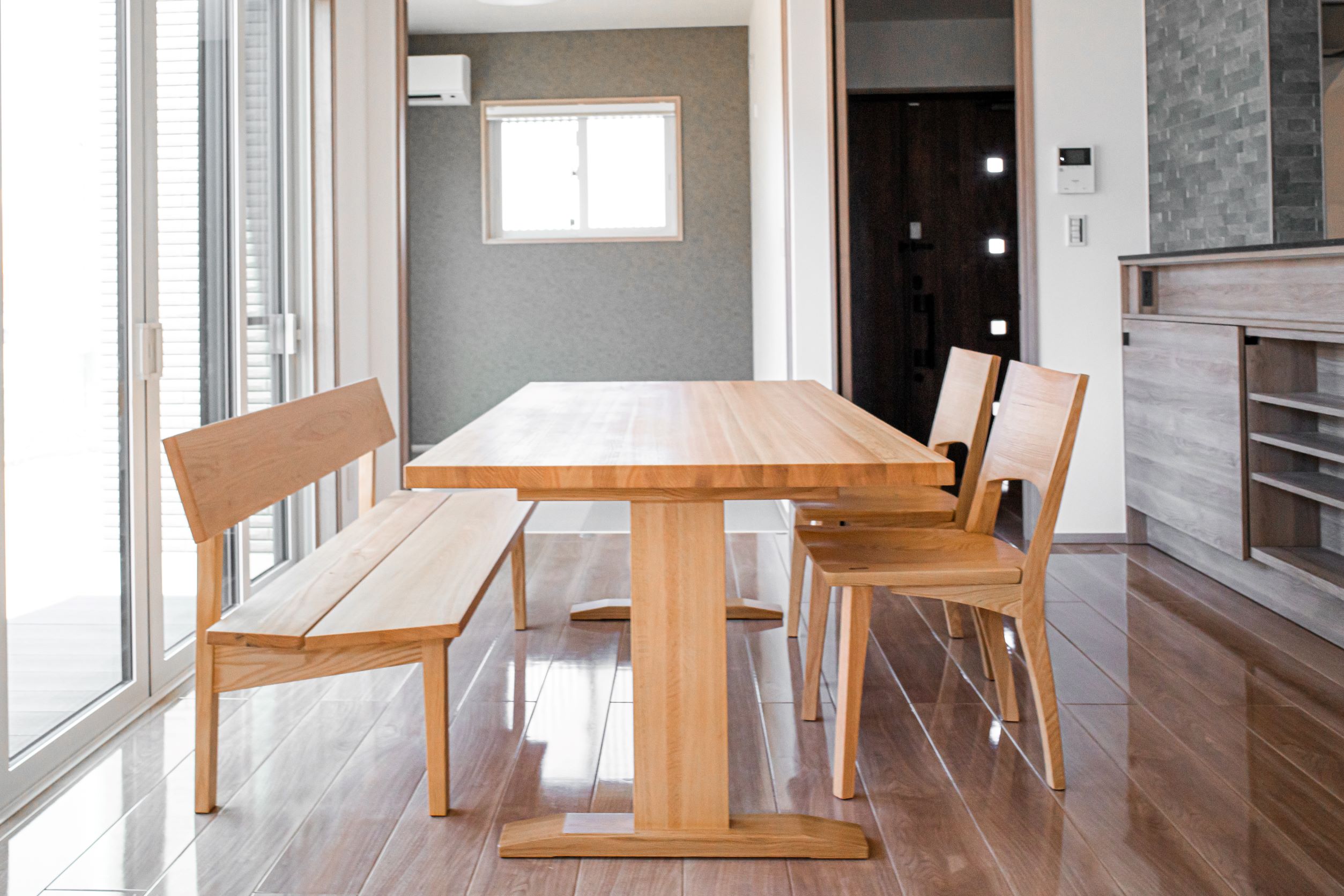 ナラ(オーク)無垢材のダイニングセットをお届けしました。幅1800ミリの大判のテーブルに背付きベンチと椅子2脚を合わせて、シンプルかつ高級感のある組み合わせに仕上がりました。テーブル脚にはT字型の2本脚をお選びいただき、ベンチにもストレスなく出入りできる仕様になっています。