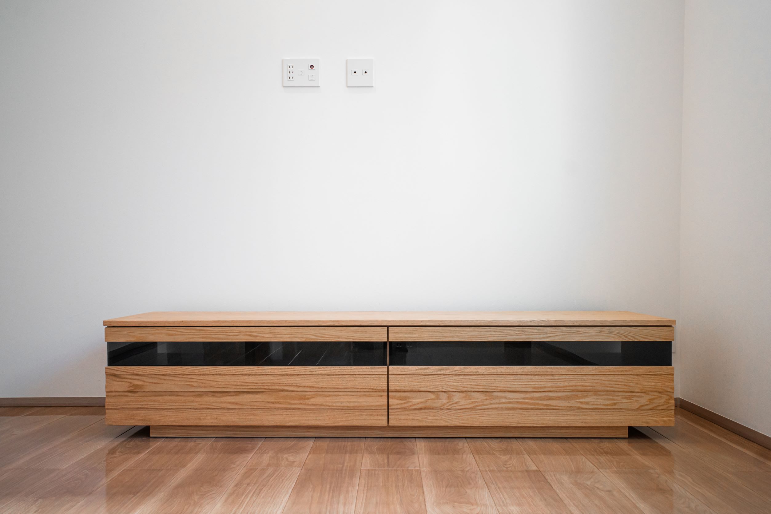 リビングスペースには同じくナラ(オーク)無垢材のテレビボードをお選びいただきました。こちらも幅2000ミリの大判サイズで迫力があり、収納力も大きく確保できています。水平方向に入ったスリットが空間の広がりも感じさせてくれる、無垢材ならではの高級感が味わえるデザインも特徴です。