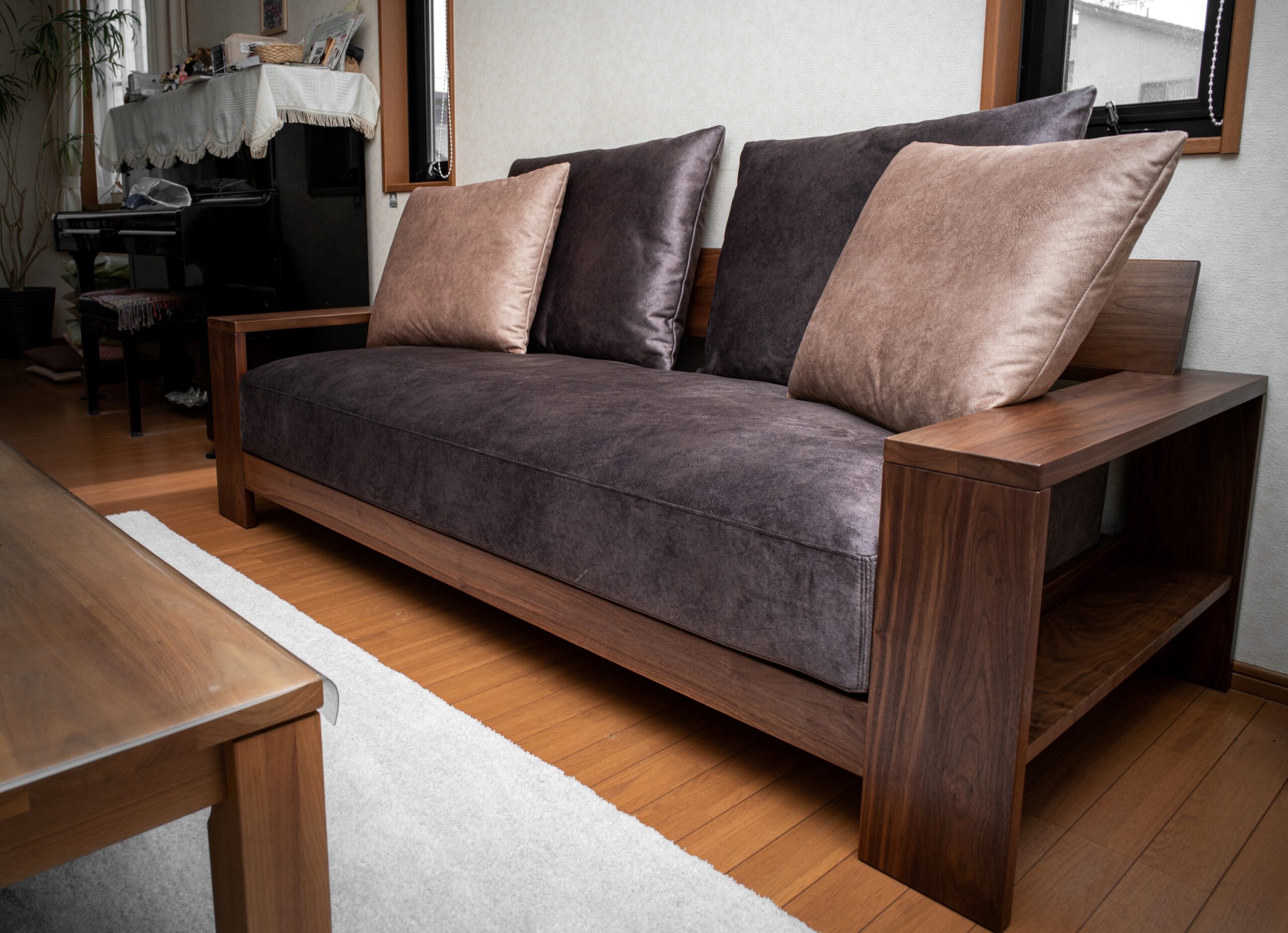 ブラックウォールナット無垢材のソファ&オットマンをお届けしました。幅広の無垢材フレームが圧巻の迫力です!カバーには起毛感と光沢のある生地をお選びいただき、高級感たっぷりの仕上がりになりました。