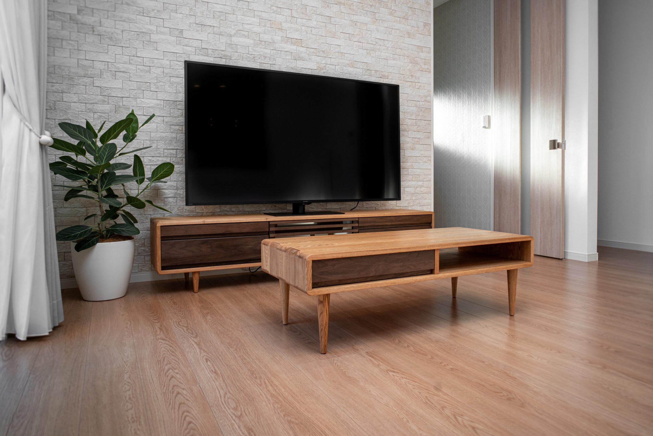 タモ(アッシュ)×ブラックウォールナット無垢材のテレビ台・センターテーブルをお届けしました。無垢材ならではの丸みのあるフォルムと、天然の色あいを活かしたツートンカラーがとても可愛らしいですね。