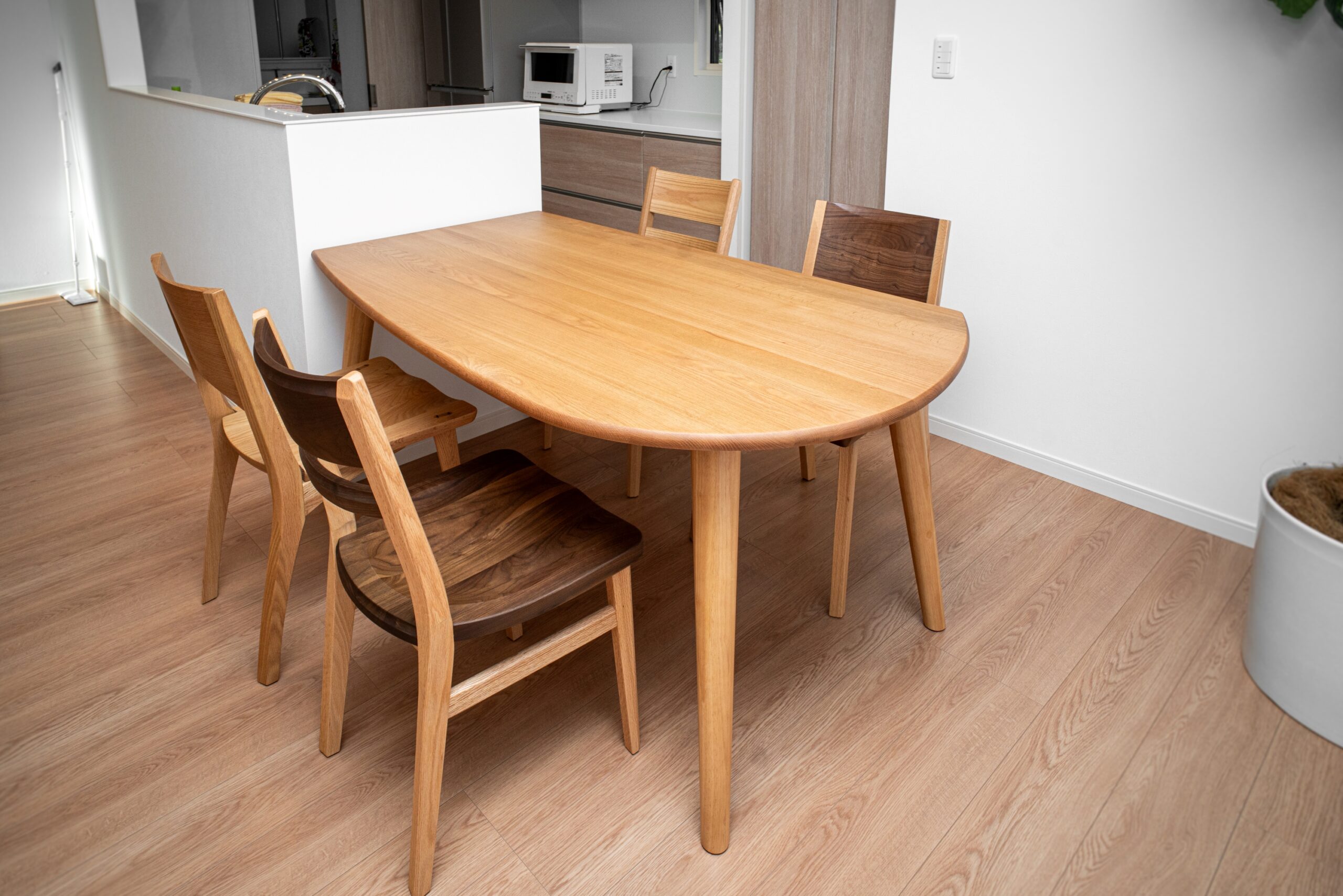 ダイニングセットにも、リビングスペースと同じくツートンカラーを意識したセットでお選びいただきました。椅子のデザインは2種類でそれぞれ単色・ツートンカラーを合わせていただき、にぎやかな印象ながらもデザインと素材でそれぞれ共通項のある組み合わせになりました。丸みのある変形テーブルも良いアクセントになっています。