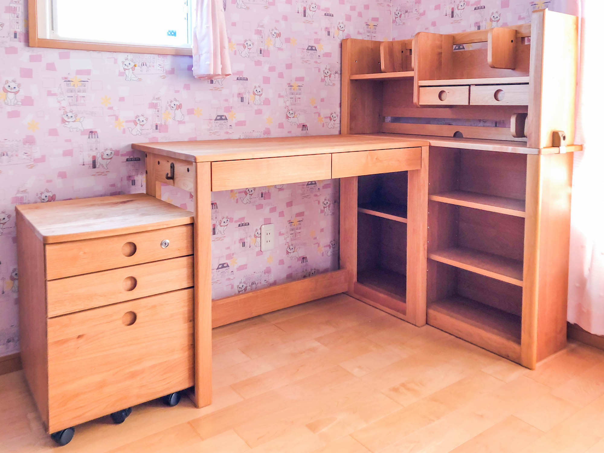 アルダー無垢材の学習デスクをお届けしました。システムタイプをお選びいただき、広いスペースを使ってゆったりと設置させていただきました。ワゴンや本棚が独立しているので、使い方に合わせて組み替えられるのも便利ですね!