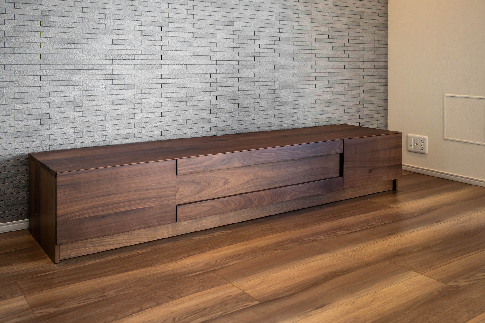 ブラックウォールナット無垢材のテレビボードをお届けしました。高級感のある流れるような木目は、背面のデザインウォールとも相性抜群!幅も2000mmと大ぶりなサイズで迫力もたっぷりです。