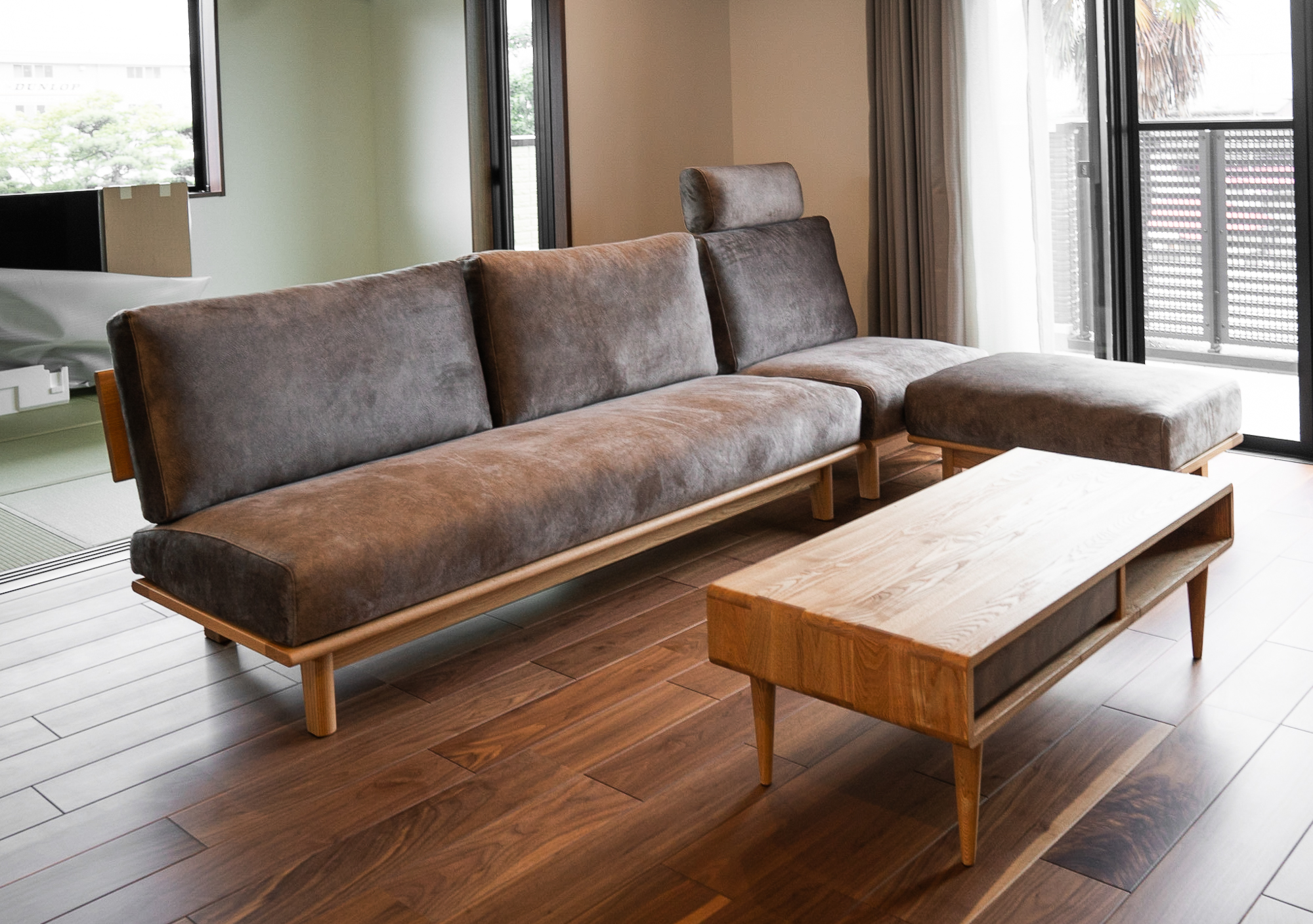 リビングスペースにはナラ(オーク)無垢材のソファとセンターテーブルをお選びいただきました。3Pと1P、さらにオットマンを組み合わせて、自由自在な使い方ができる組み合わせになりました。クッションカバーも落ち着いた色合いが綺麗です。並べて置くと迫力たっぷりですね!