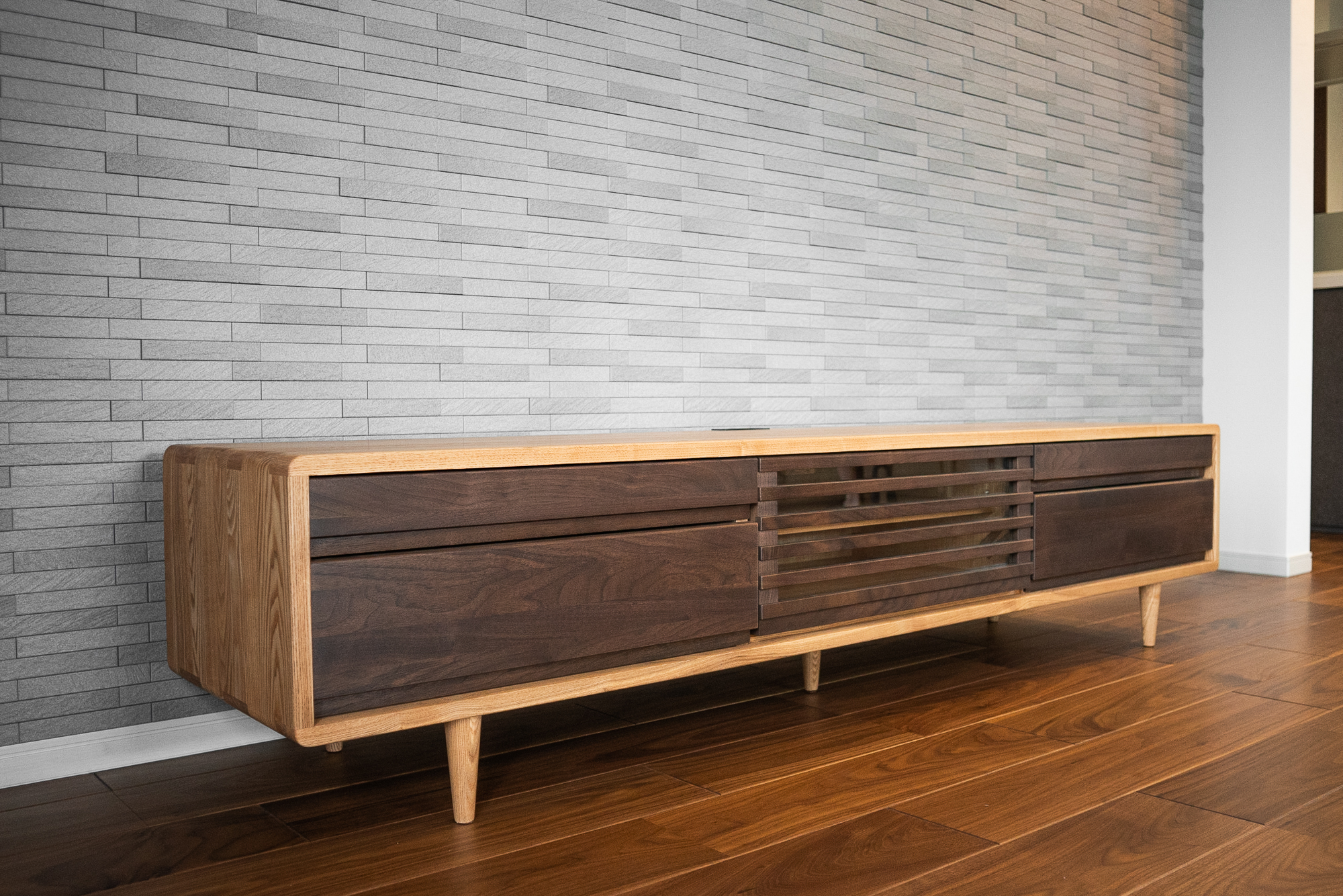 テレビボードにも、やはりツートンタイプをお選びいただきました。大空間を活かした幅1800ミリサイズで、大型のテレビにも対応できます。ダイニング・リビングで共通の素材を用いた、贅沢な空間に仕上がりました。