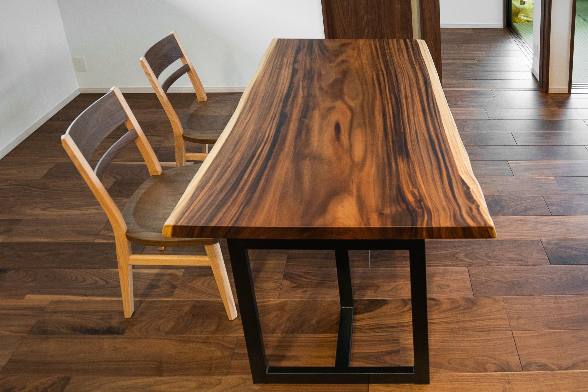 モンキーポッド一枚板のダイニングテーブルと、ナラ(オーク)×BKウォールナット無垢材のチェアをお届けしました。モンキーポッドらしい色合いの天板に合わせて、椅子もツートンでお選びいただきました。無垢材ならではの高級感もありつつ、可愛らしい組み合わせです。