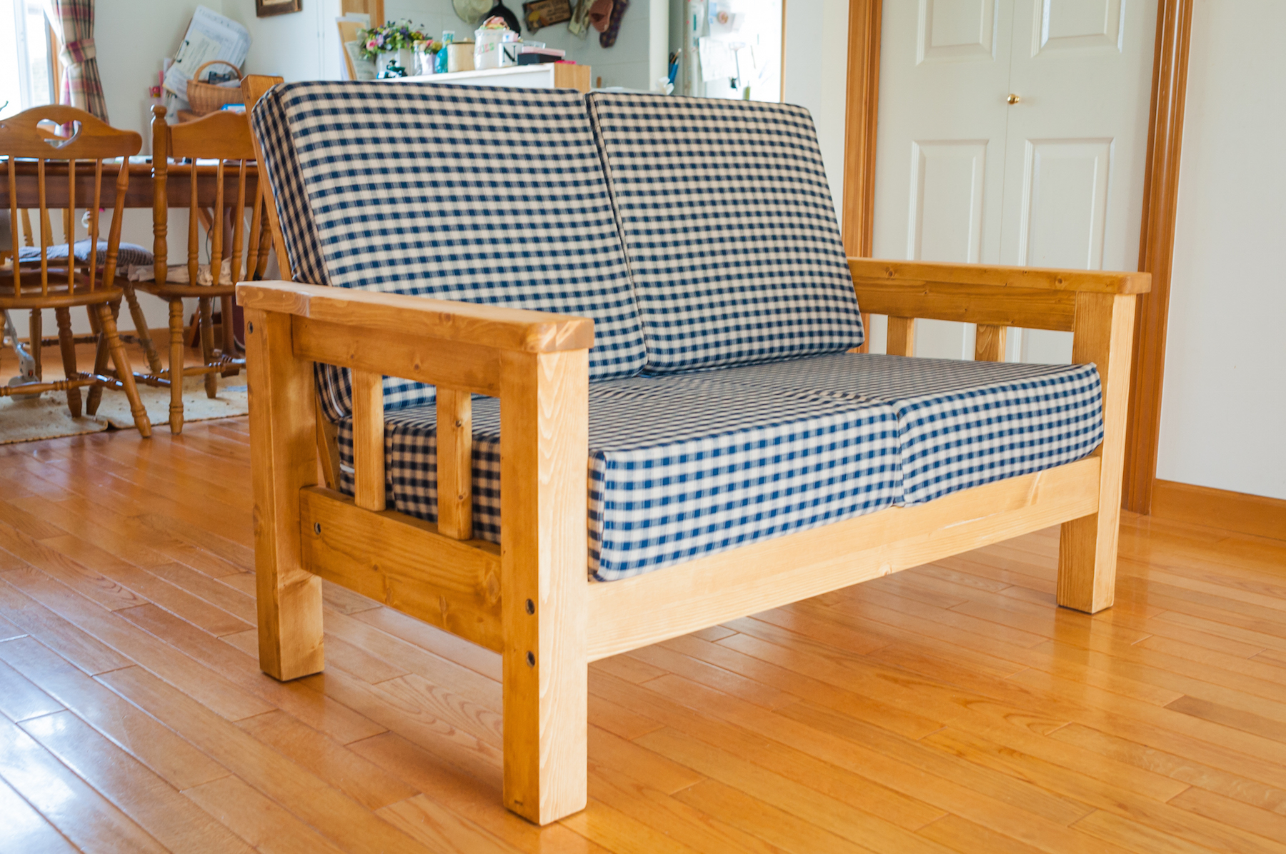 カラーは正統派のパイン色に、カントリーらしいブルーチェックのカバーを合わせていただきました☆ダイニングセットをはじめ、カントリー調のインテリアで統一された素敵な空間になりました♪