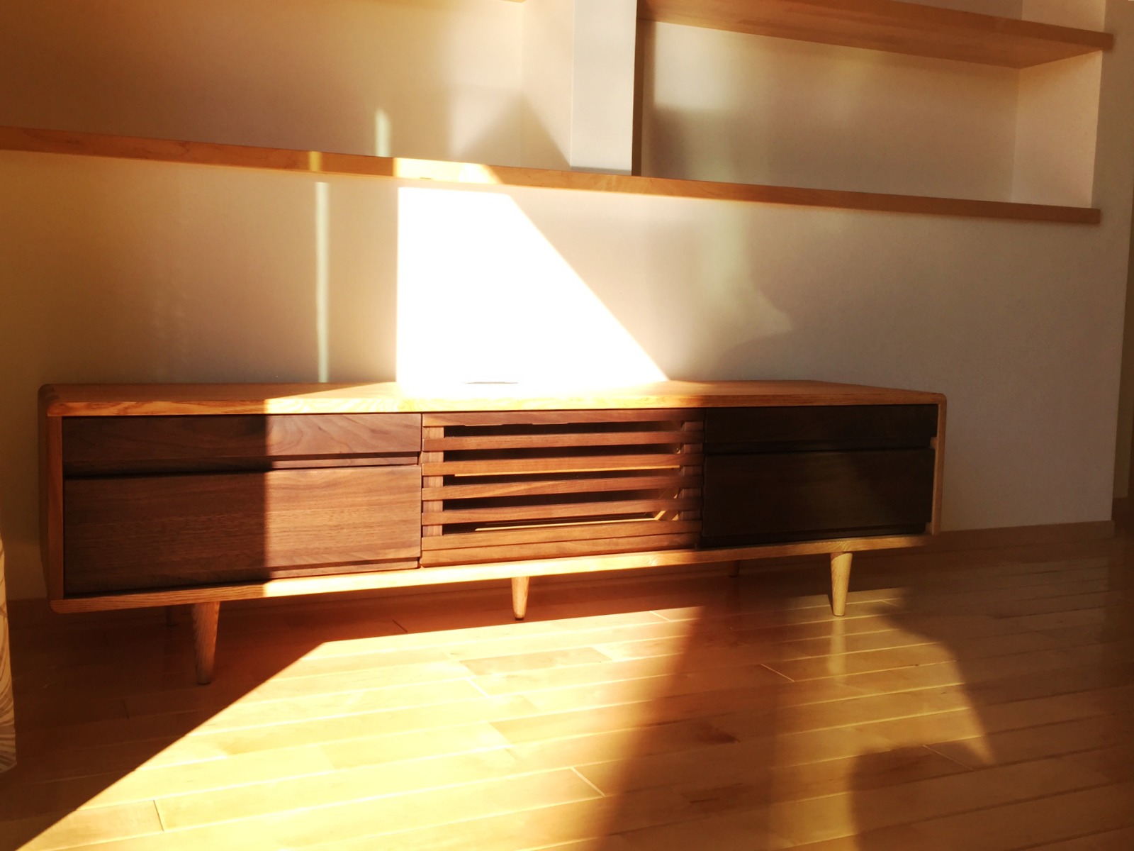 ブラックウォールナット×アッシュ無垢材のテレビボードです。