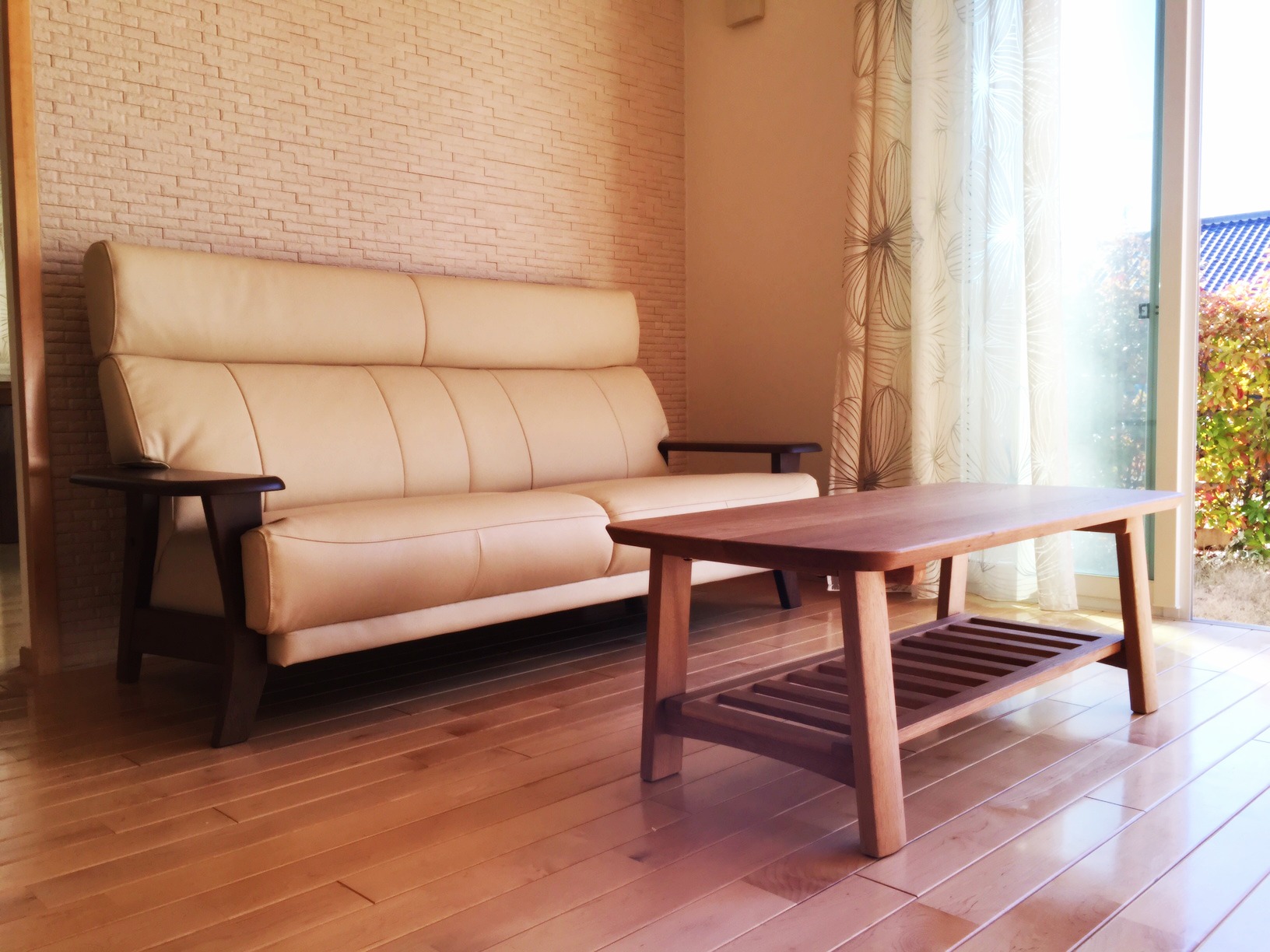 本革のソファにオーク無垢材のセンターテーブルを合わせました。