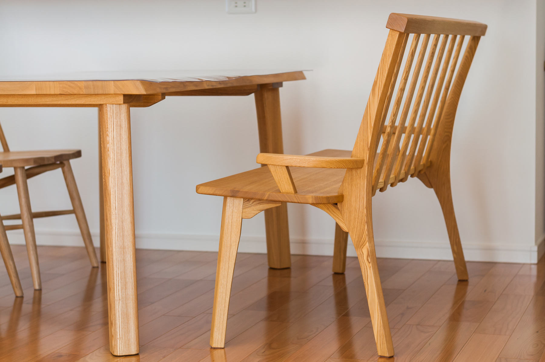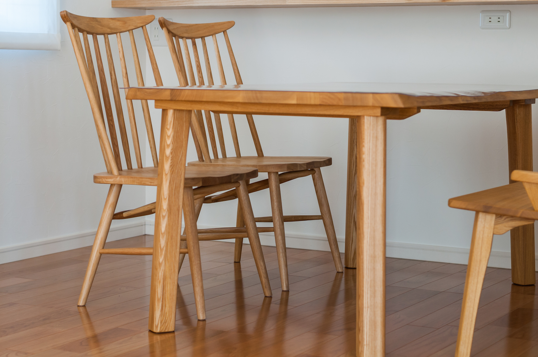 こちらもタモ(アッシュ)無垢材のダイニングテーブルと、背付きベンチです。