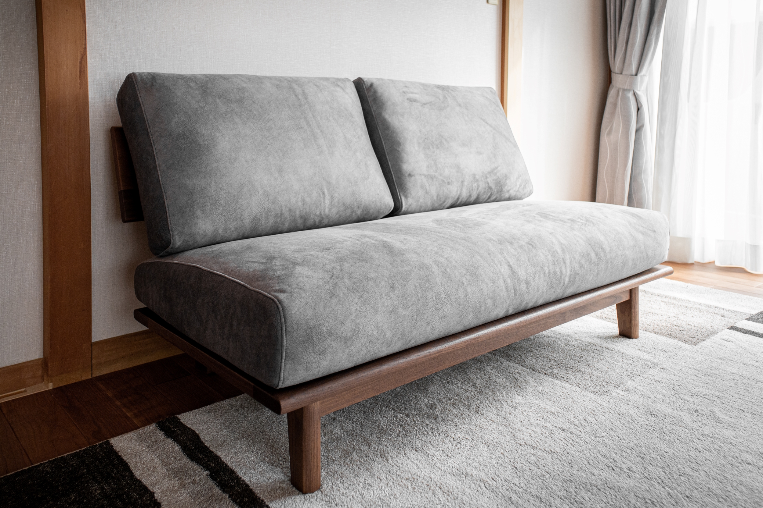 ブラックウォールナット無垢材のソファをお届けしました。アームレスでコンパクトながら無垢材の高級感が味わえることに加えて、コイルスプリングを採用したクッションは座り心地も抜群です!ライトグレーでお選びいただいた微起毛のカバーも光沢があってとても綺麗です。