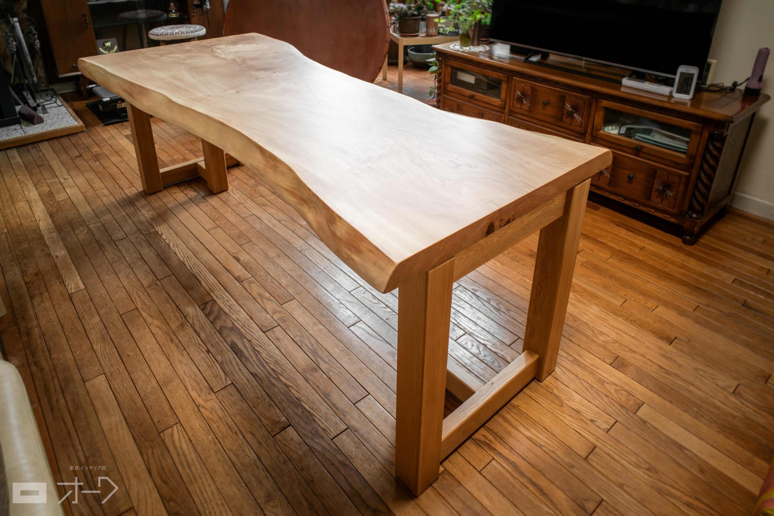 栃(トチ)一枚板のダイニングテーブルをお届けしました。幅2000㎜を超える大判の板は、まさにダイニングスペースの主役にふさわしい貫禄です。脚部はナラ(オーク)無垢材をお選びいただき、ナチュラルな印象に加えて、太い部材で大きな天板をしっかり支えてくれる安心感も感じられる仕上がりになりました。