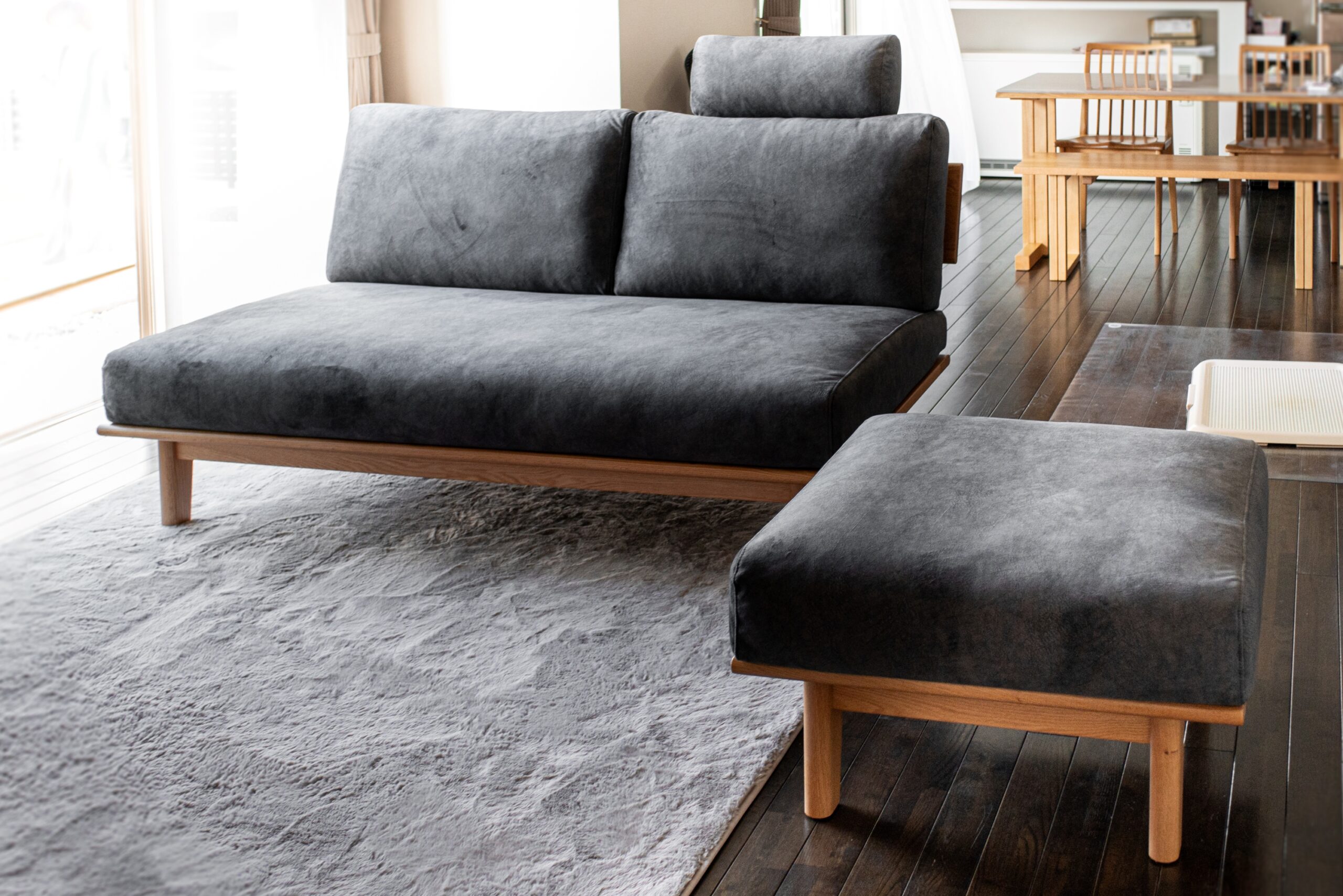 ブラックウォールナット無垢材のソファをお届けしました。無垢材の質感に加えて、カバーの生地も起毛感と光沢のある高級感たっぷりの組み合わせでお選びいただきました。ヘッドレストとオットマンも合わせてご用意させていただき、リラックス度満点のリビングスペースになりました。