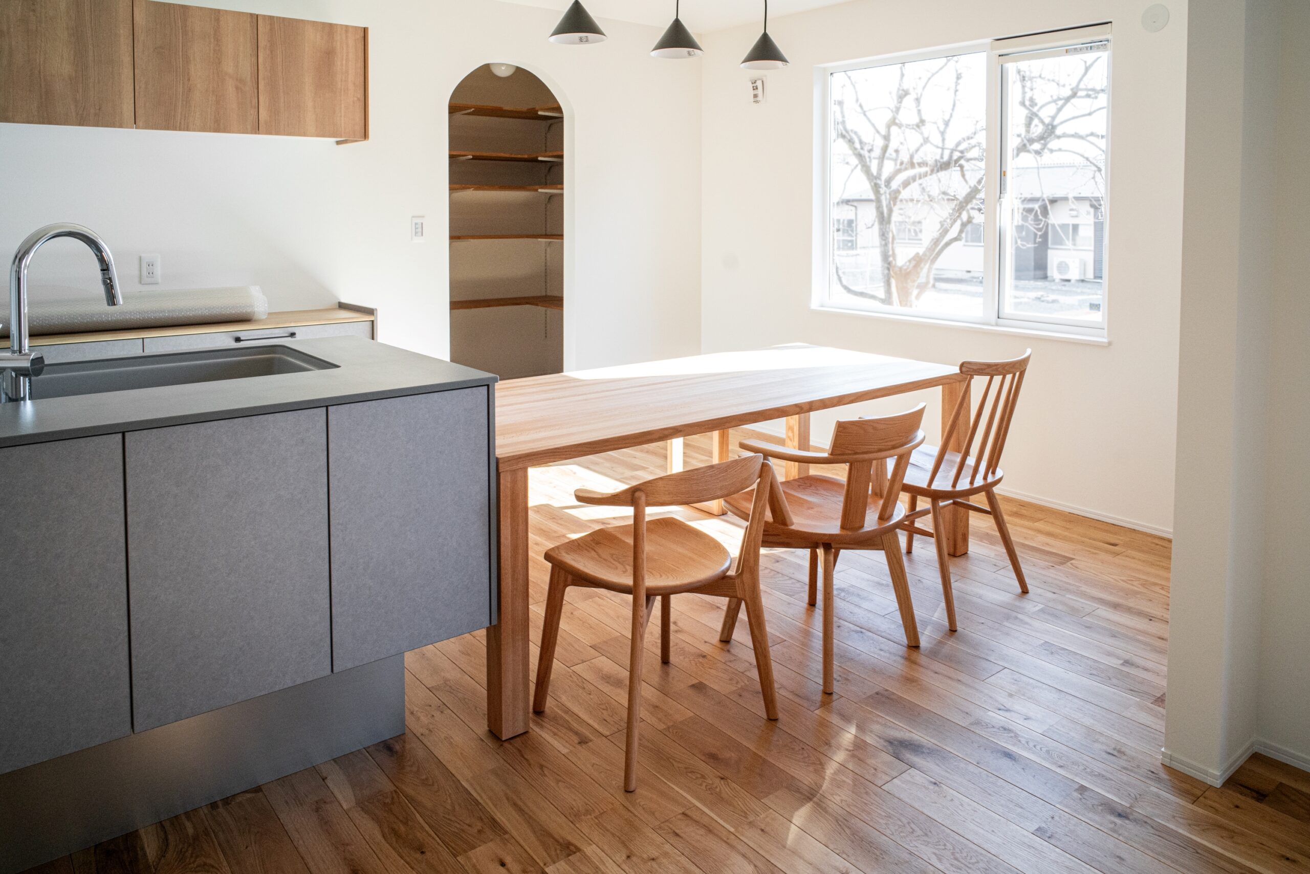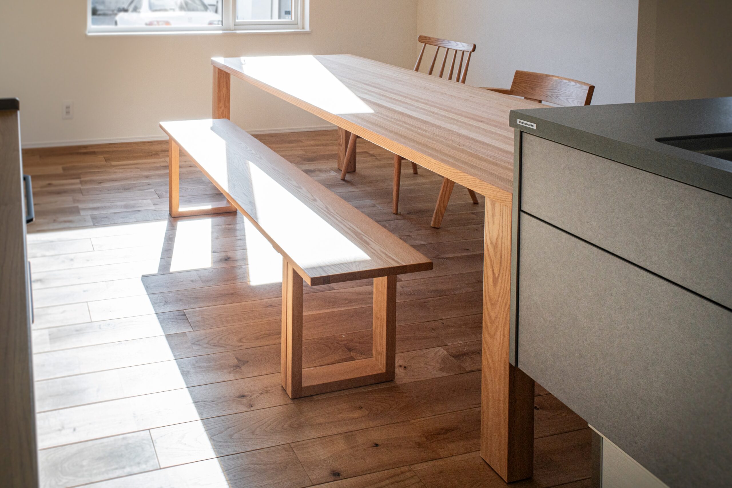 ナラ(オーク)無垢材のダイニングセットをお届けしました。幅2000の大判のテーブルは迫力があります。キッチンに横並びに置けるように設計段階からスペースを広く設けておられたとのことで、家事動線も考慮した素敵なレイアウトになりました。椅子は3脚ともデザインを変えて遊び心もありつつ、無垢材の質感の良さを楽しめる組み合わせになりました。