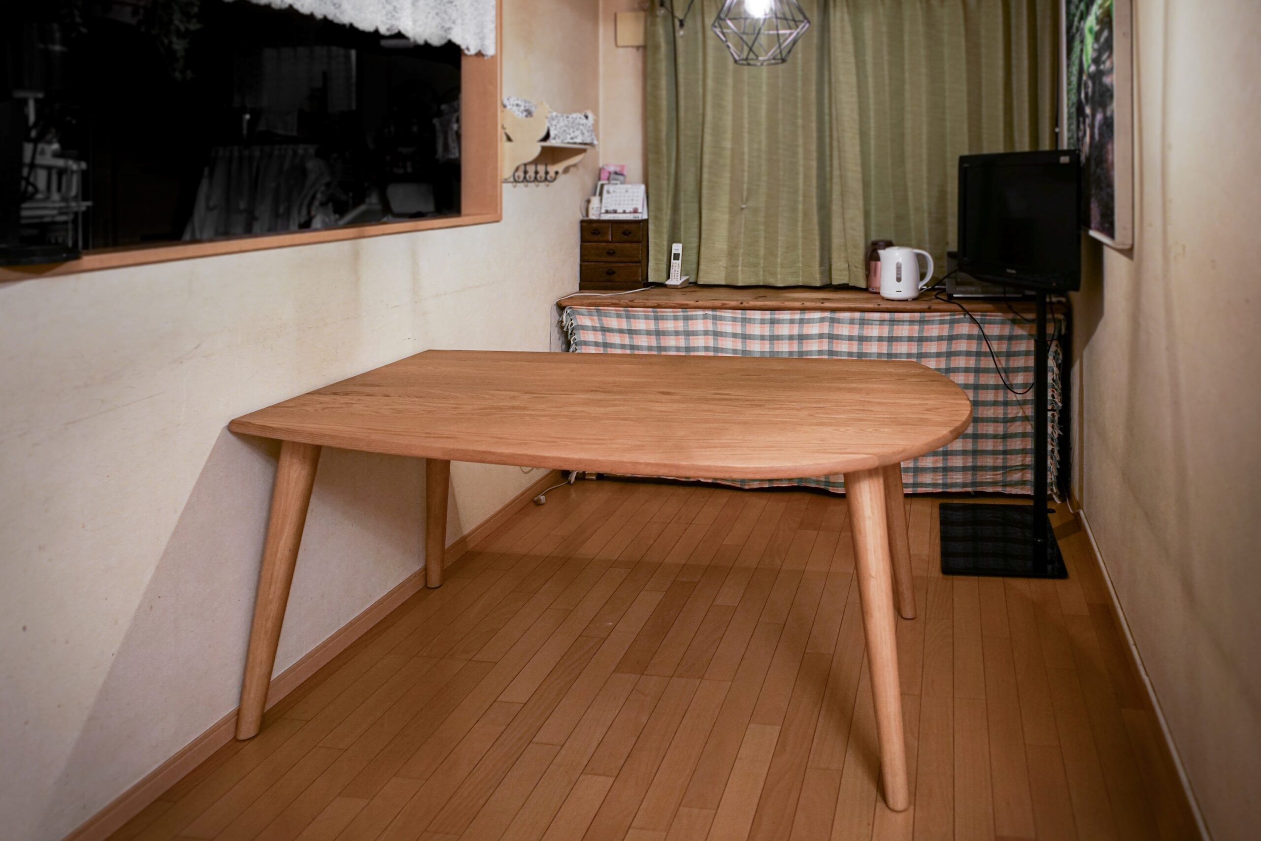 オーク無垢材のダイニングテーブルをお届けしました。無垢座ならではの質感を活かしたなだらかな曲面が特徴的な天板は、実際のサイズよりも小ぶりな印象で4~5人掛けでお使いいただくのに最適です。ペンダントランプとの相性もばっちりで、可愛らしく優しい印象の空間に仕上がりました。
