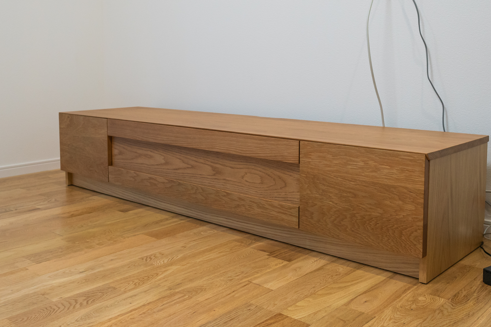 リビングスペースのテレビ台も、同じくナラ(オーク)無垢材です。フローリングとも同素材で相性もばっちり!デザインがとてもシンプルな分、質感の良さが際立ちます。