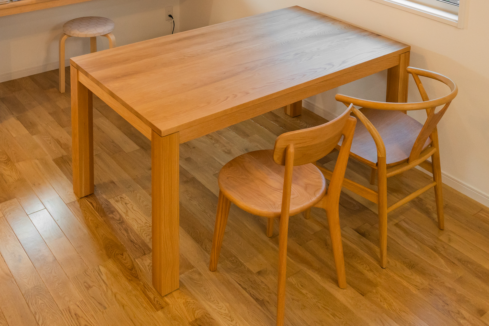 ナラ(オーク)無垢材のダイニングセットをお届けしました。シンプルな4本脚に、デザイン違いの椅子を合わせています。素材を統一しているので、全く違和感なくおしゃれにまとまります。