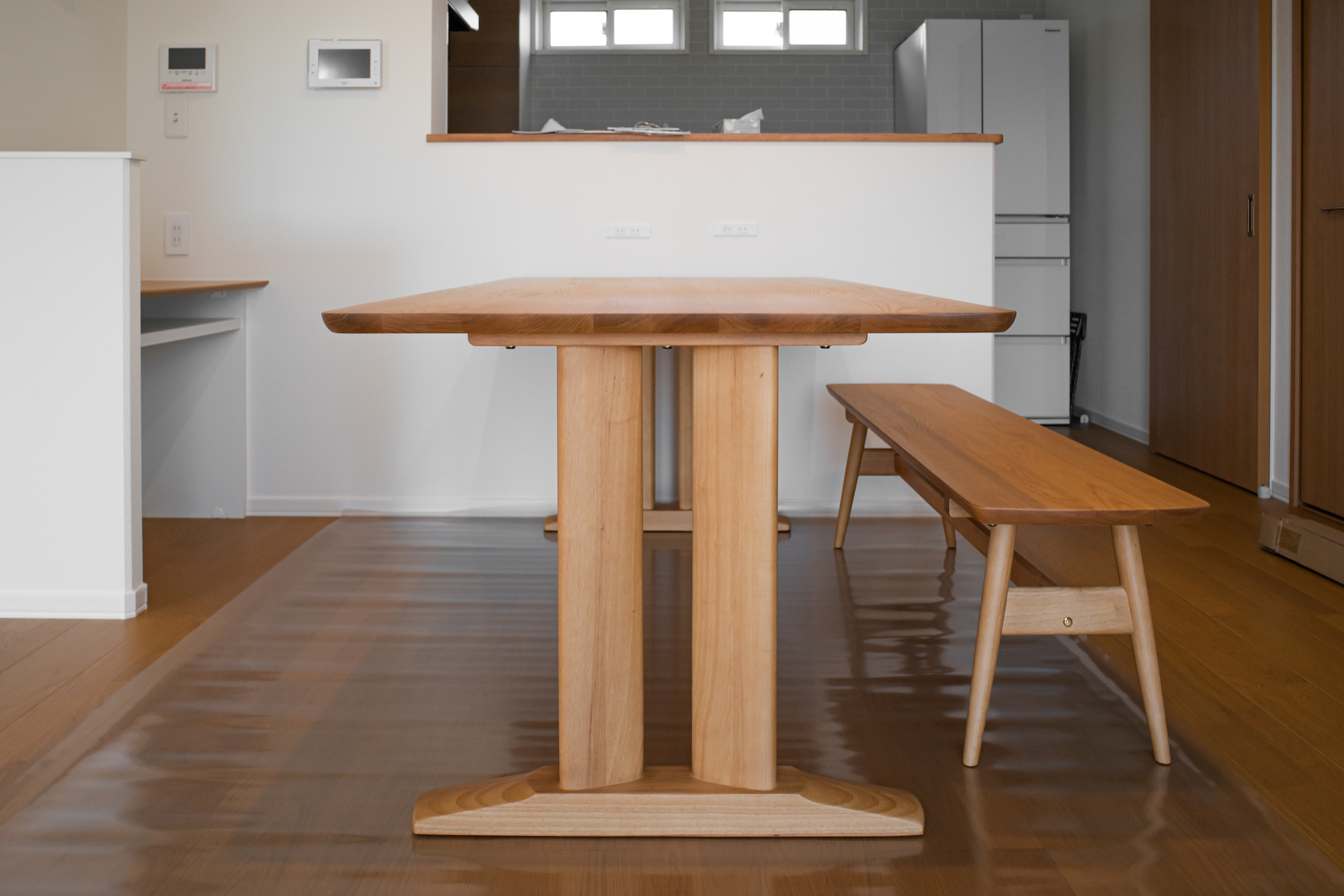 ナラ(オーク)無垢材のダイニングテーブル&ベンチをお届けしました。天板は1800×900ミリの大判サイズながら、船底面という面取り加工を施してあるのでスッキリとした印象です。ベンチも天板に合わせて丸みのあるデザインをお選びいただき、統一感のある雰囲気になりました。
