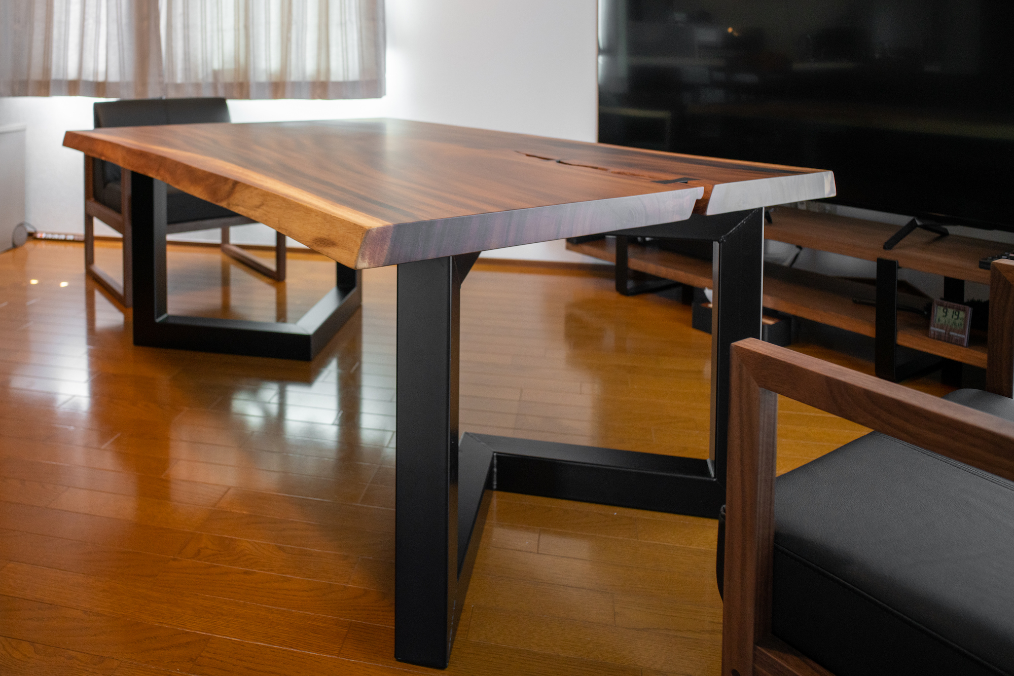 モンキーポッド一枚板のダイニングテーブルをお届けしました。大胆な割れの造形が特徴的な、一枚板ならではの迫力がたっぷり味わえる一枚です。良く見ると、左中に中心が1つずつあることが分かります。実は2本の木が1本につながって成長した木から採れた板なんですね。こんな面白いテーブルに出会えるのも、一枚板ならではの魅力です。
