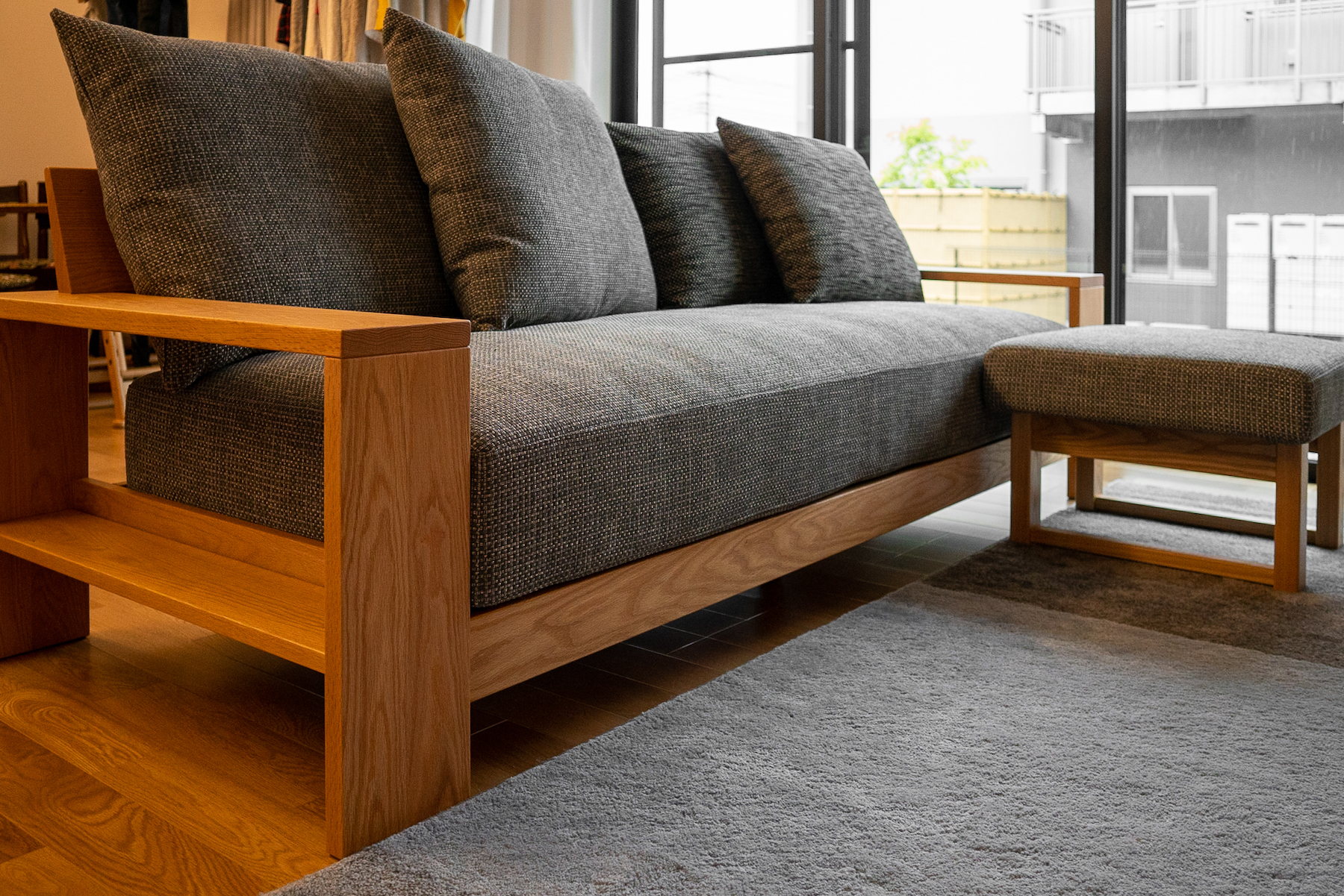 ナラ(オーク)無垢材のソファセットをお届けしました。3.5人掛けの大型サイズと継ぎ目のない座面クッション、そして幅広の肘が迫力たっぷり!オットマン(足置き)も合わせてお選びいただき、ゆったり寛げる空間になりました。