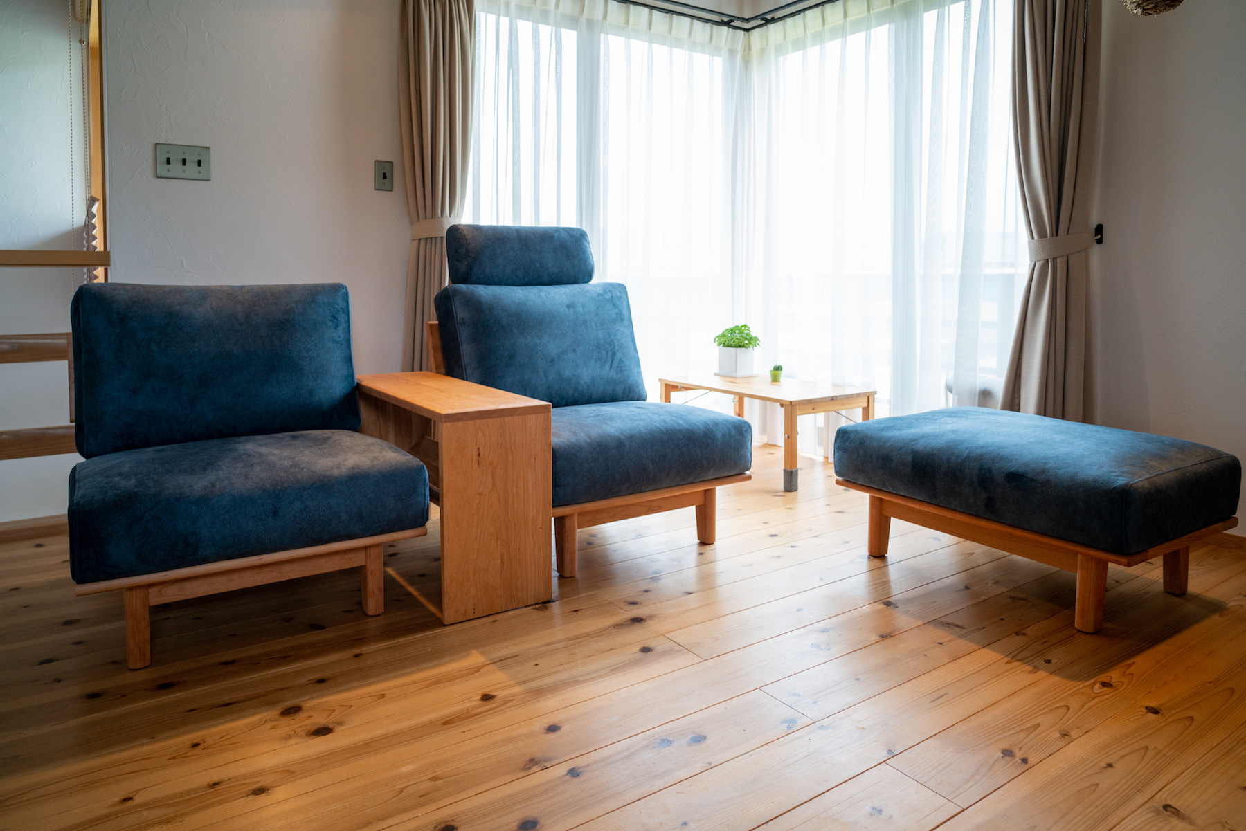 ブラックチェリー無垢材のソファセットをお届けしました。オレンジ色がかった色合いが特徴的な木部に、光沢感のあるダークブルーのカバーが良く似合います!一人掛けを2台並べて配置しつつ、大ぶりなサイドテーブルとオットマン(足置き)も合わせてお選びいただきました。座って良し、眺めて良しの素敵なリビングスペースに仕上がりました。