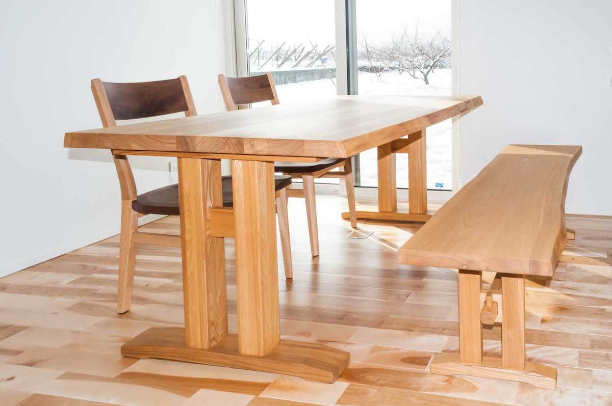 タモ(アッシュ)無垢材×ブラックウォールナット無垢材のダイニングセットをお届けしました。耳付きの45㎜厚のテーブルの天板は、落ち着いた自然な雰囲気が楽しめます。椅子の背と座には高級材料のブラックウォールナットが使われているタイプをお選びいただき、2トーンカラーのお洒落な空間に仕上がりました!