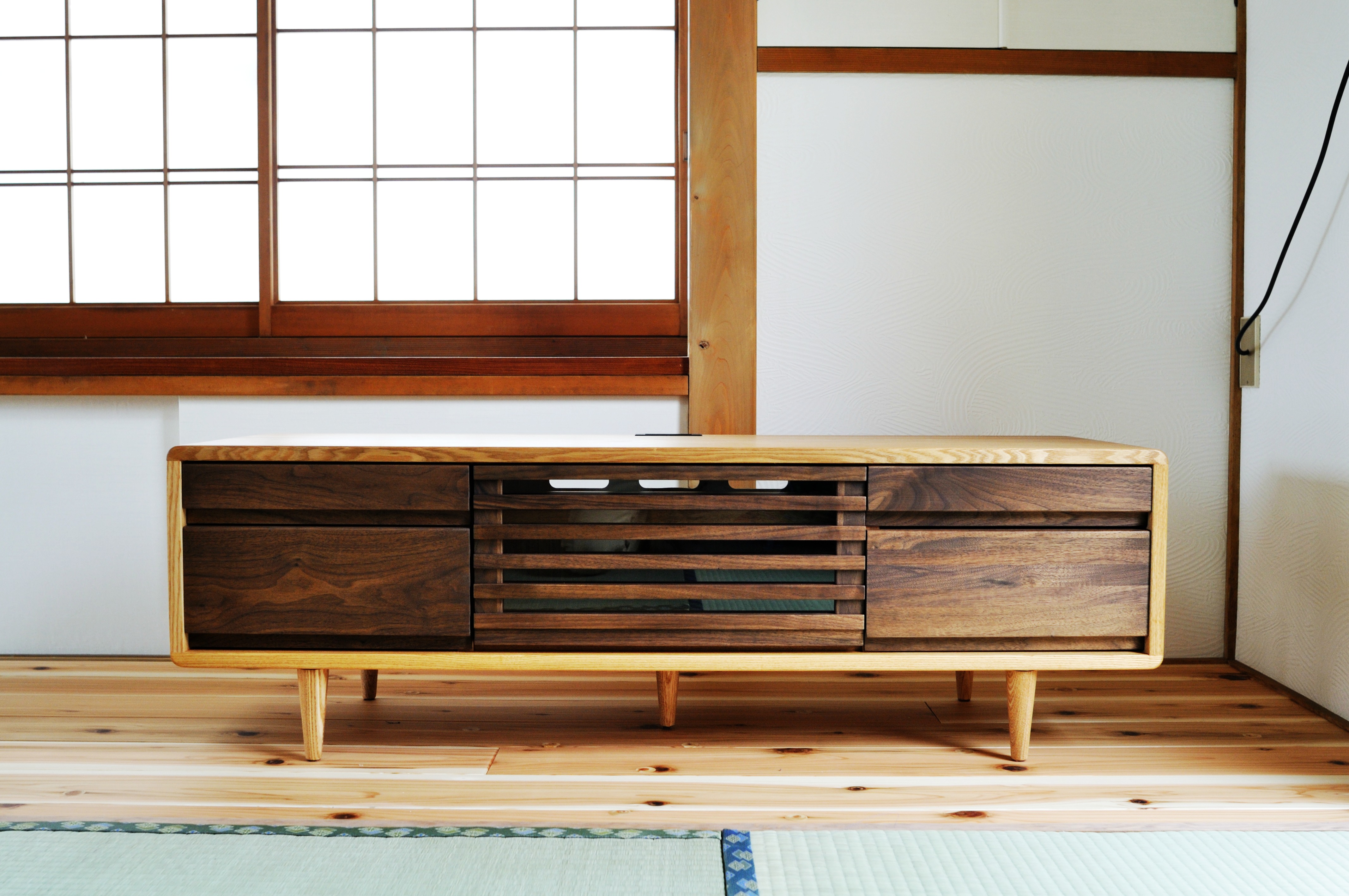 タモ(アッシュ)無垢材×ブラックウォールナット無垢材のTVボードです。