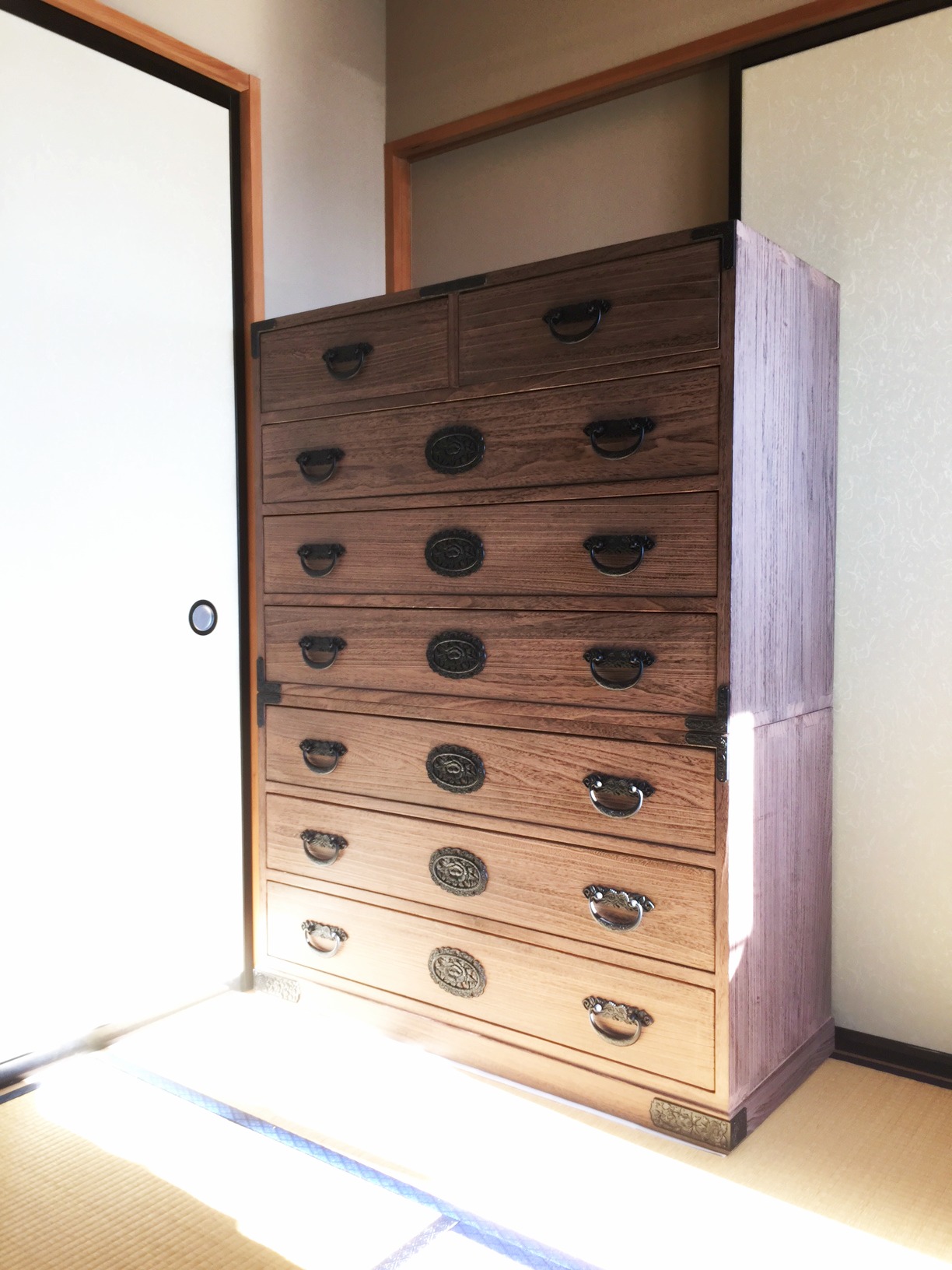 重厚な造りと金具で、畳敷きのお部屋にほどよい緊張感を加える一品です。 和服も収納できる幅広の引出しの収納力も頼もしいですね☆