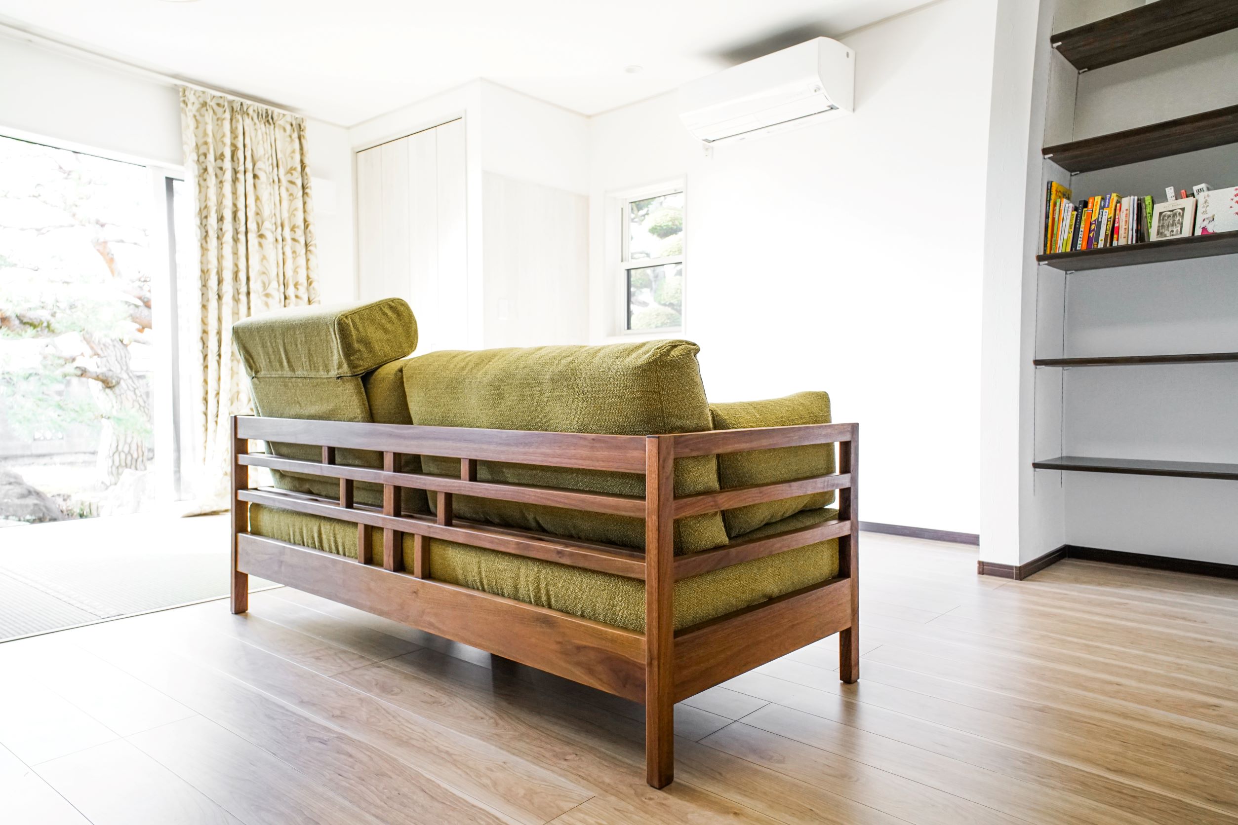 ブラックウォールナット無垢材のソファをお届けしました。背面のデザインが特徴的なフレームで、お部屋の空間を緩やかに仕切るようなレイアウトで置く方に人気のデザインです。すっきりとした細身の部材を組み合わせており、高級感のあるモダンな印象に仕上がっています。