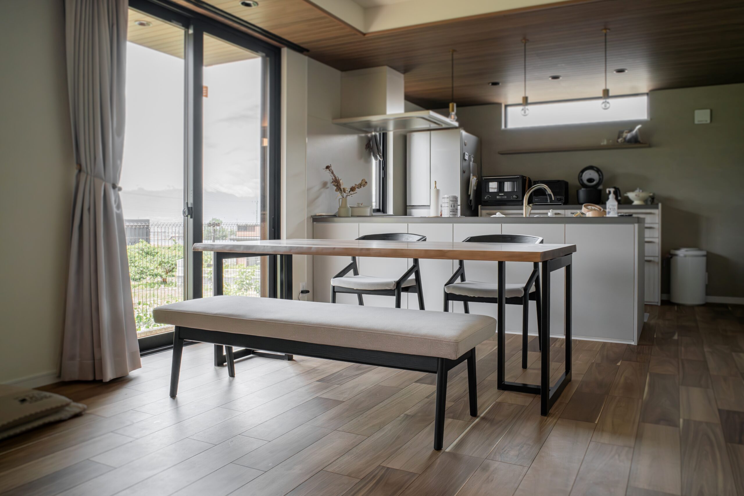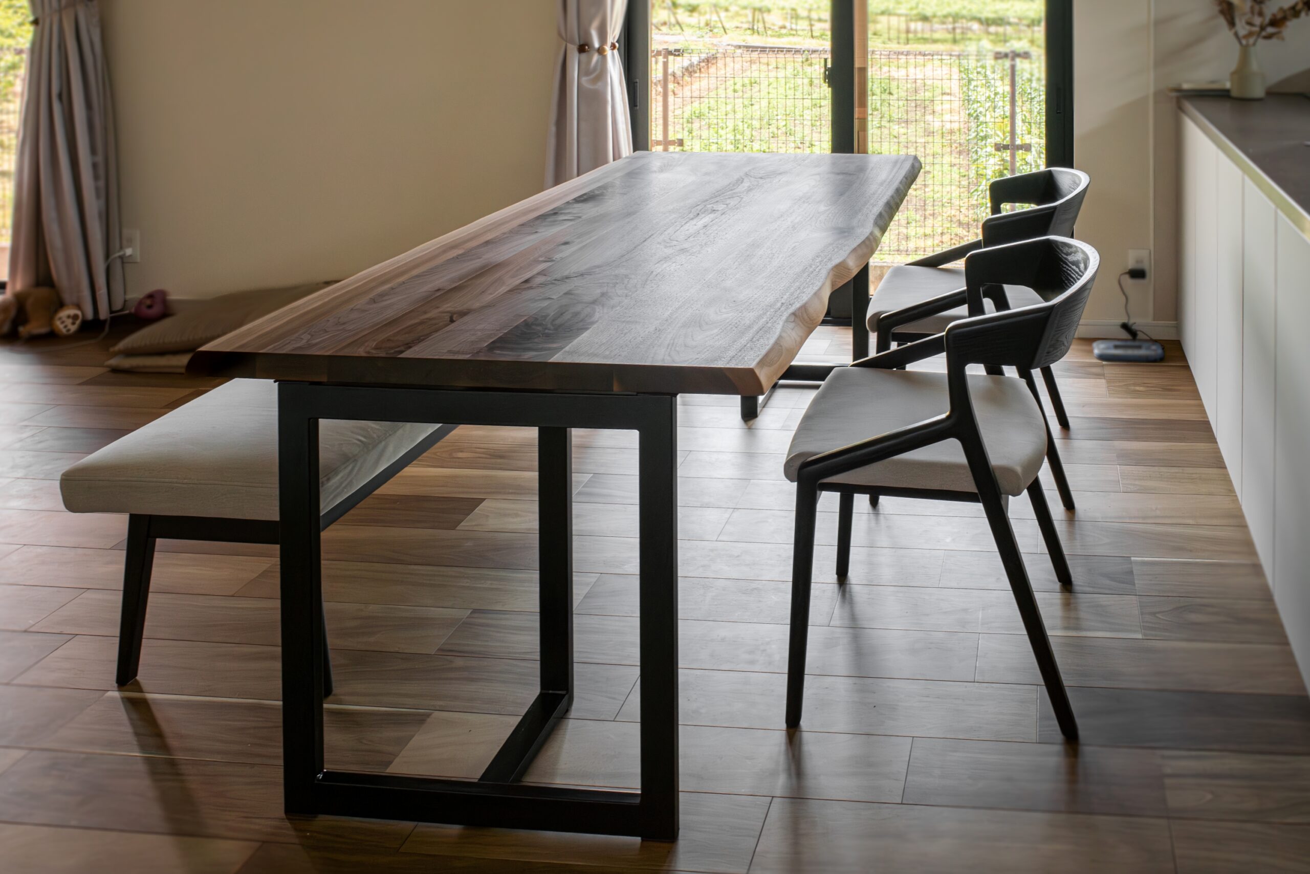 ブラックウォールナット無垢材のダイニングセットをお届けしました。テーブルの天板は“耳付き”と呼ばれる、丸太の表面を残した仕上げでワイルドな雰囲気が楽しめます。椅子とベンチの木部は艶消しのブラック塗装で仕上げており、引き締まった印象に仕上がりました。