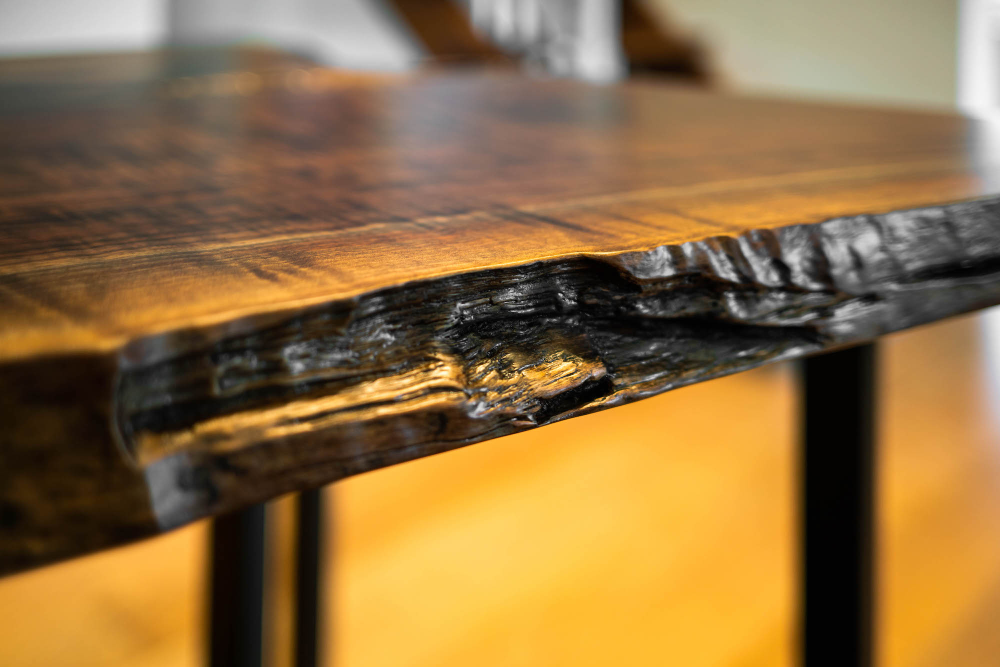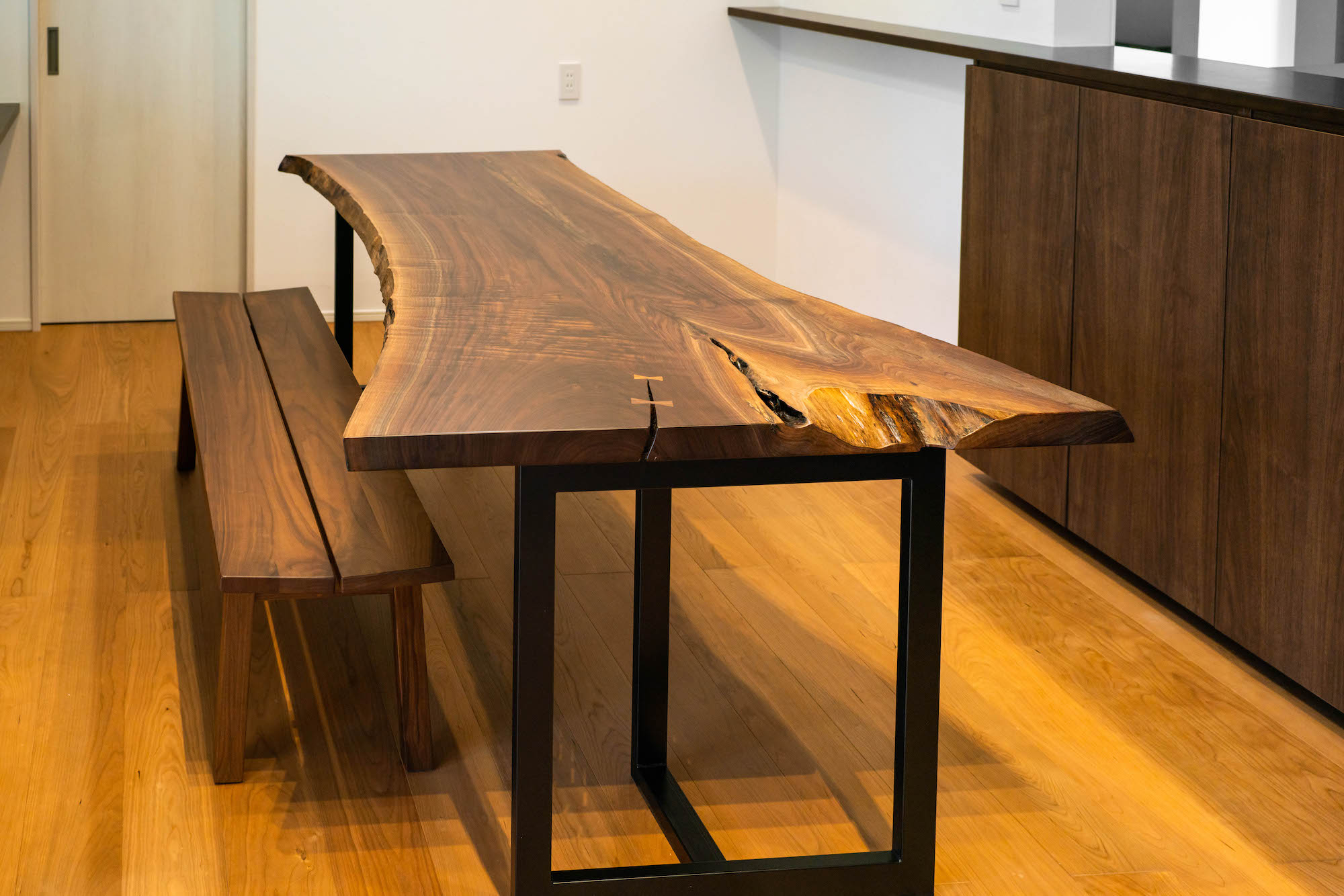 ブラックウォールナット一枚板のダイニングテーブル&ベンチをお届けしました。大きくうねった耳と、大胆な造形。これぞ、一枚板ならではの迫力です!凹凸がある箇所もきれいに仕上げているので、ささくれが刺さるような心配もありません。他では得られない存在感にうっとりしてしまいますね。