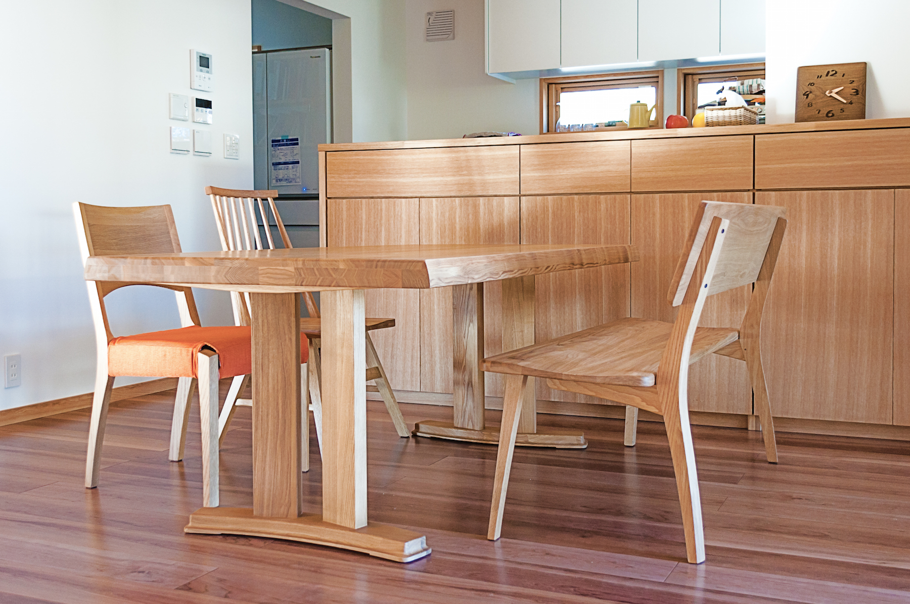ナラ(オーク)無垢材のダイニングセットをお届けしました。 たっぷりと厚みのある天板が存在感抜群!背付きのベンチとお好みのチェアを合わせていただき、ナチュラルな優しい雰囲気あふれるダイニングルームになりました♪