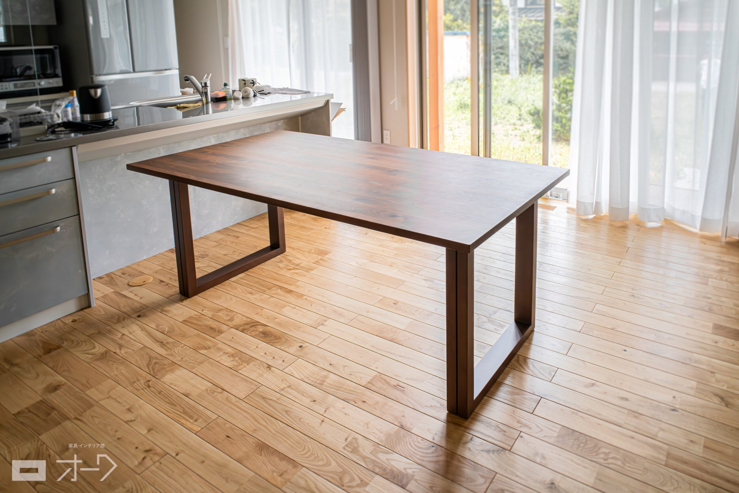 ブラックウォールナット無垢材のダイニングテーブルをお届けしました。幅1800㎜の大判サイズで、シンプルな角面仕上げの天板はブラックウォールナット無垢材の高級感がダイレクトに楽しめる一品です。大人数で囲んで賑やかに過ごせるテーブルに仕上がりました。