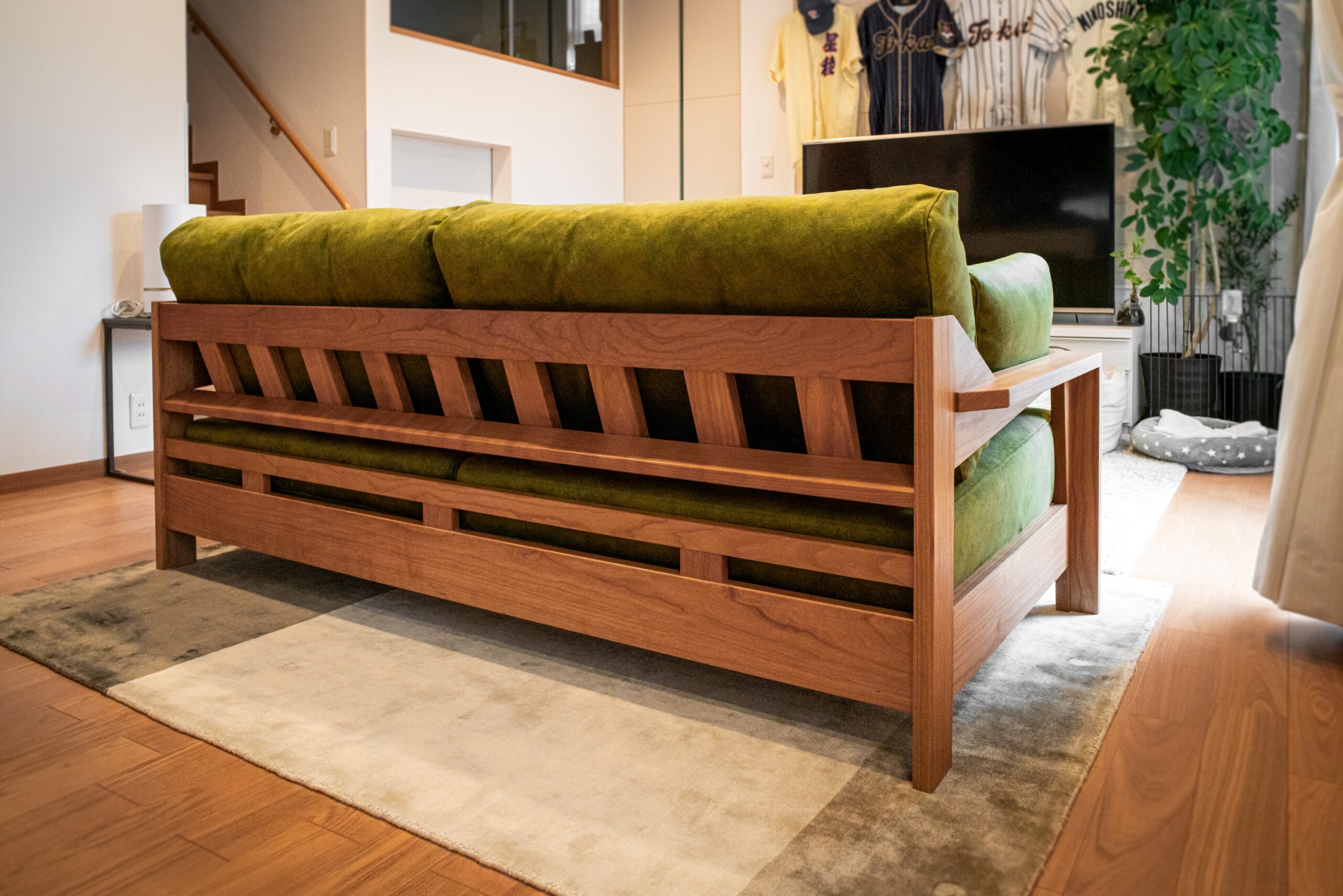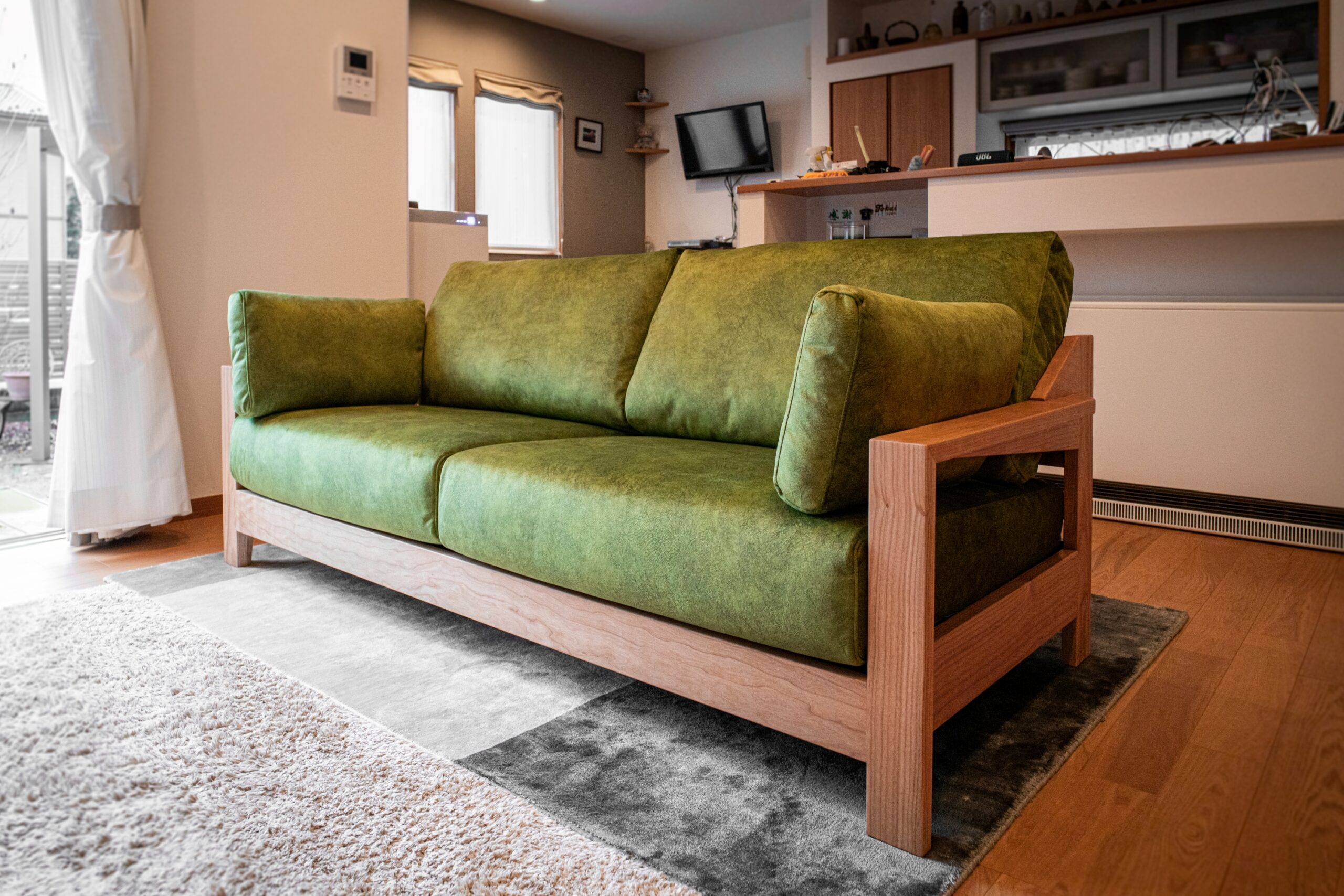 ブラックチェリー無垢材のソファをお届けしました。背面から見たときのデザインにこだわったフレームは迫力満点!カバーには光沢感のあるグリーンの生地をお選びいただき、フレッシュな印象に仕上がりました。スクラッチフリーでペットとご一緒にくつろいでいただくこともでき、ご家庭でのお洗濯も可能な高機能生地です。