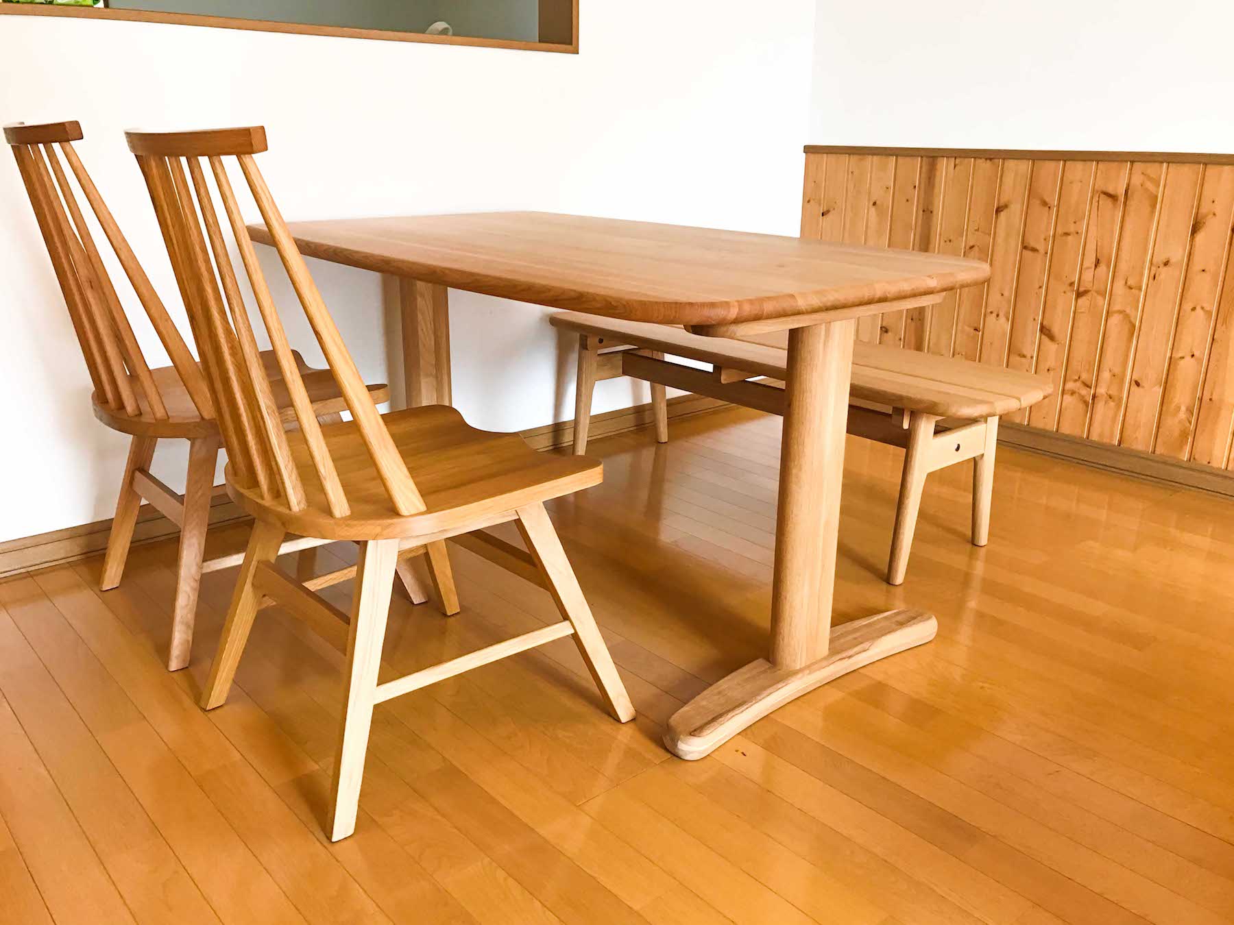 ナラ(オーク)無垢材のダイニングセットをお届けしました。テーブルとベンチには丸みのある天板を使って、優しい雰囲気に仕上がっています。オイル仕上げの手触りも心地よく、愛着のある家具に育ってくれそうです!