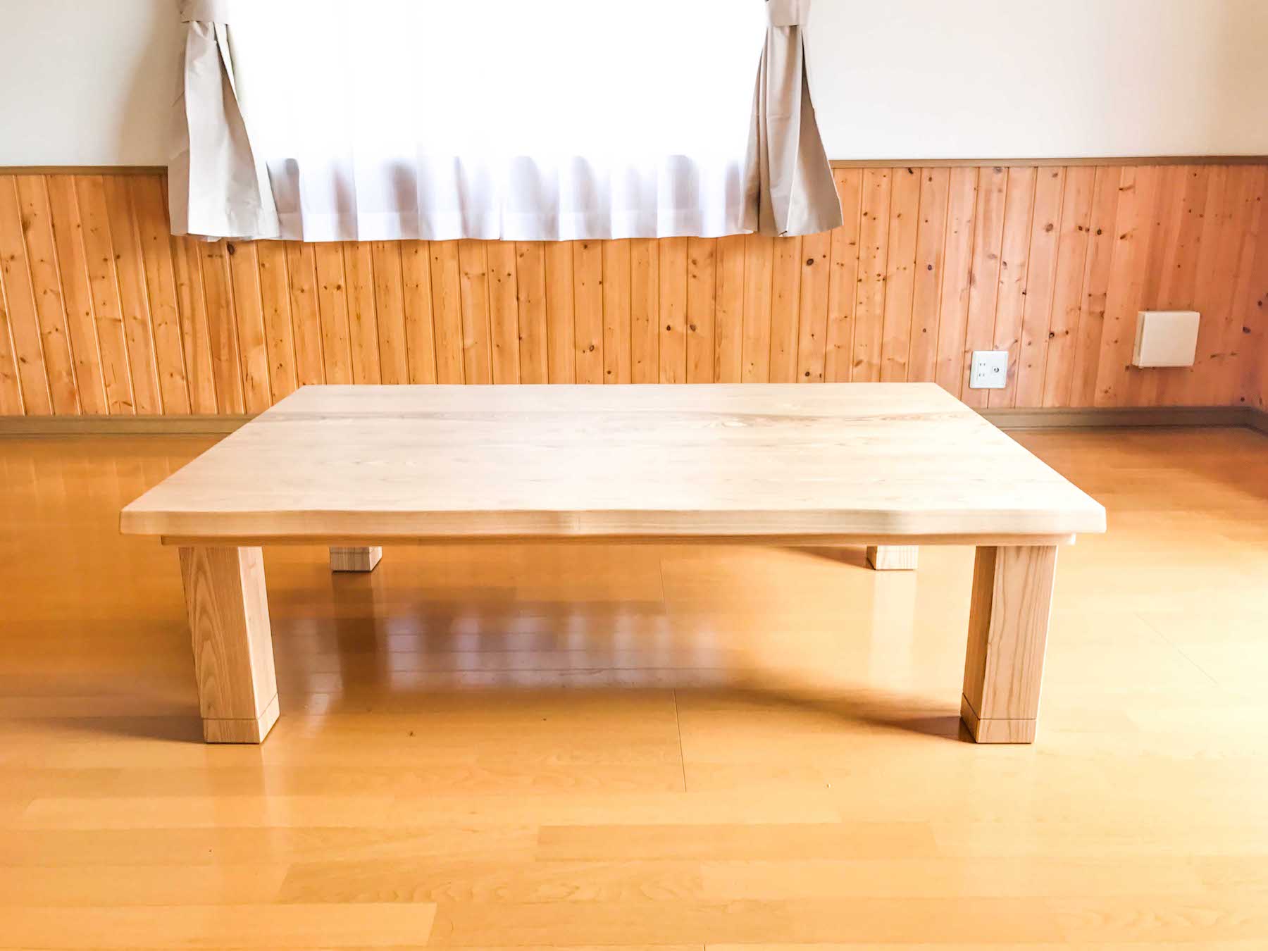 リビングスペースには、タモ(アッシュ)無垢材のこたつをお選びいただきました。35㎜厚の天板は、一見こたつには全然見えないとよく驚かれます。ヒーターの熱で天板が割れないように考慮した構造だからこそできる、季節を問わずに使える本格家具です。