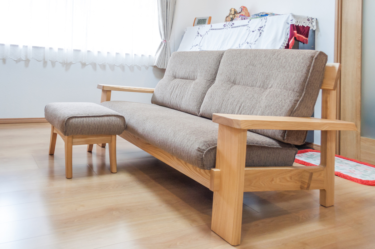タモ(アッシュ)無垢材のソファをお届けしました。大人2人がゆったりと座れるサイズで、どっしりとしたパーツが見た目にも安定感を感じさせてくれます。同素材でオットマン(足乗せ)もお選びいただき、リラックス度満点のリビングルームになりました。