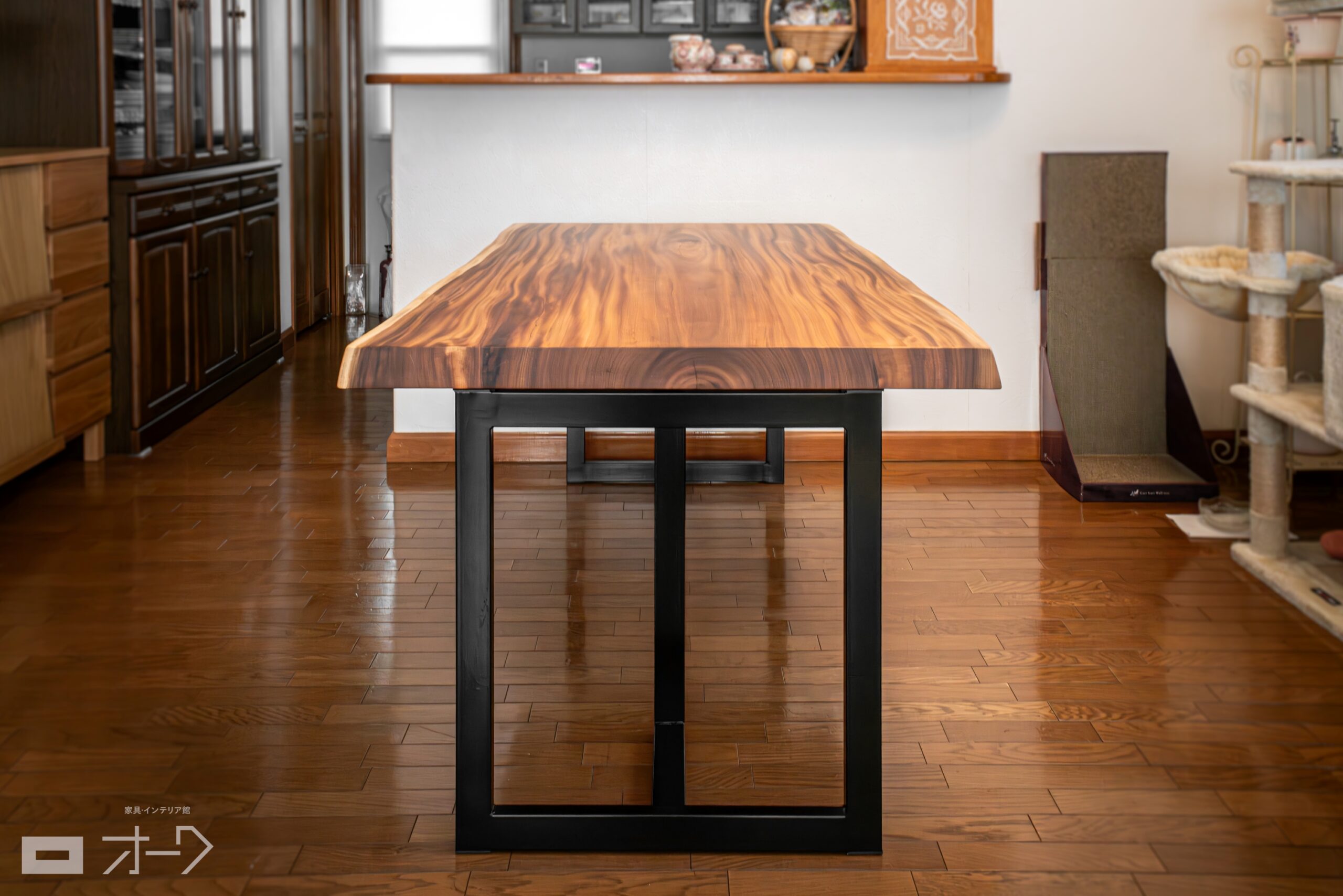 モンキーポッド一枚板のダイニングテーブルをお届けしました。厚みのある板と、明暗のはっきりしたモンキーポッドらしい木目が迫力たっぷりの一枚です。スチール製の脚も引き締まった印象で格好いいですね。